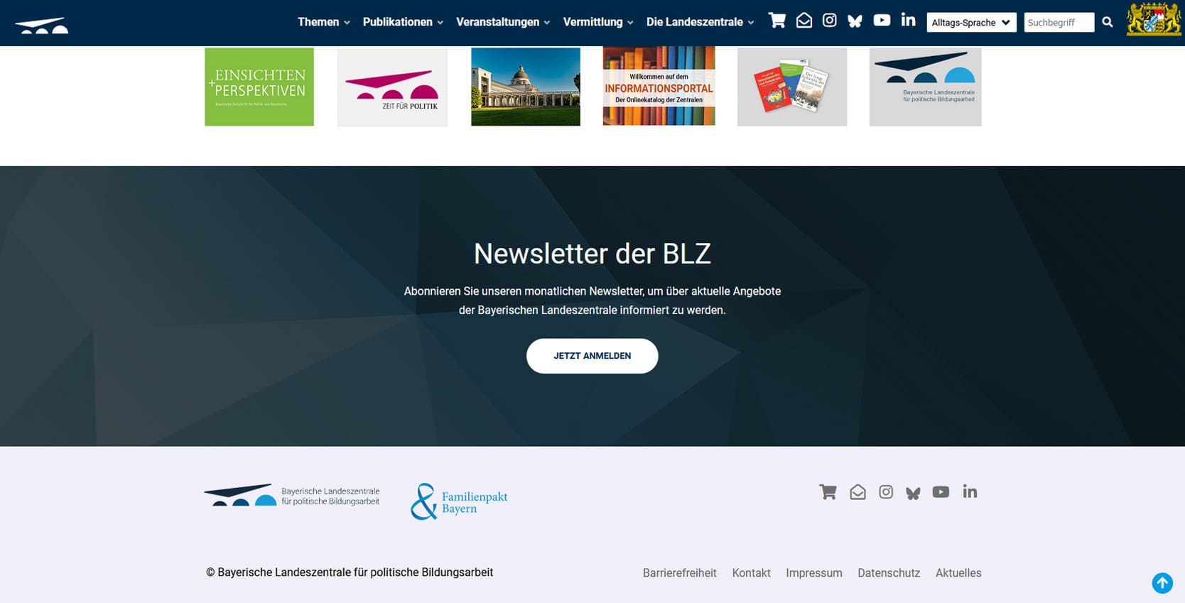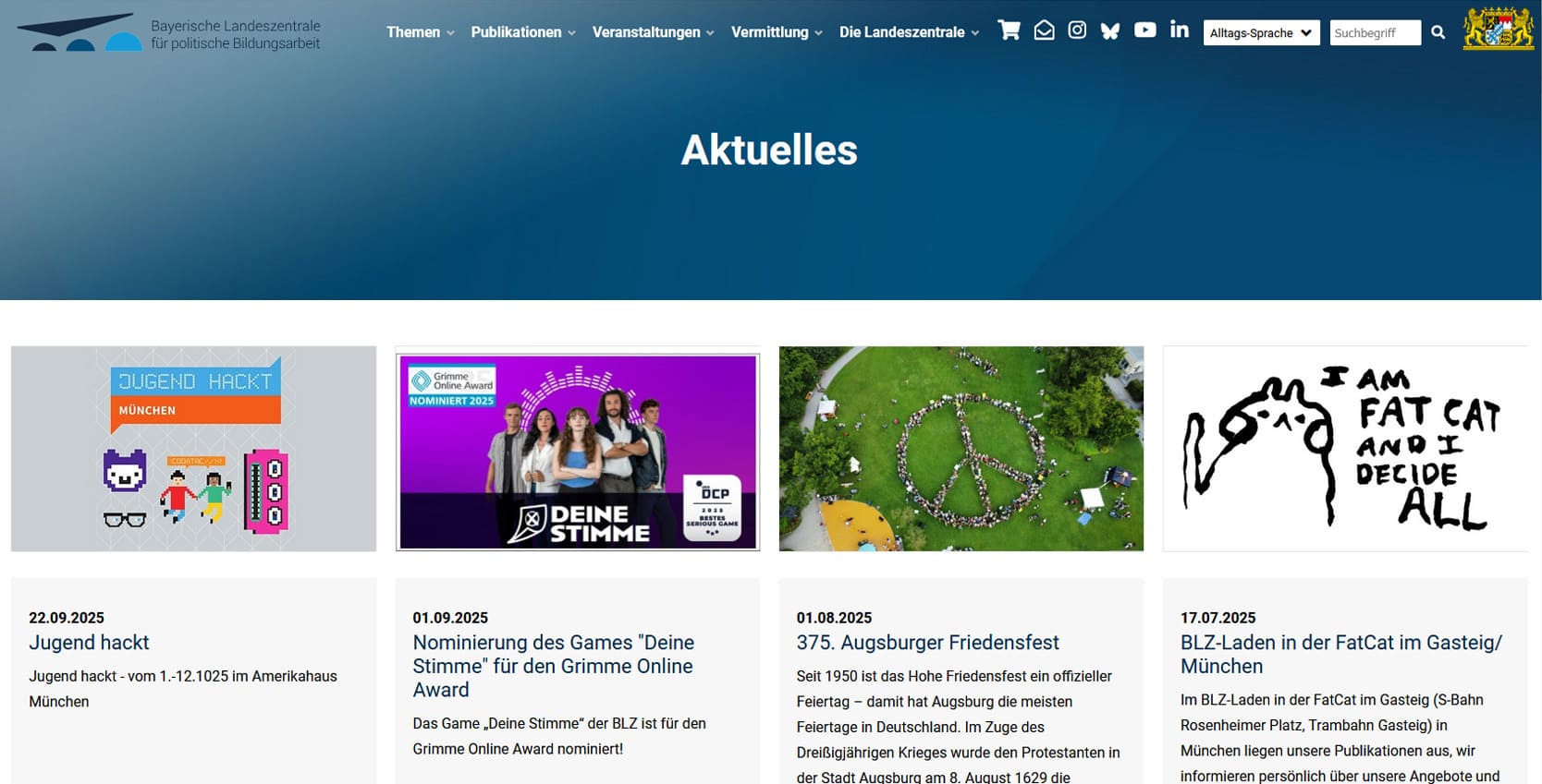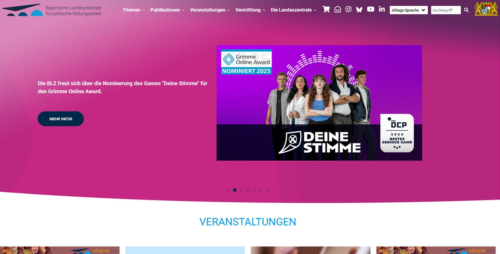 Die Bayerische Landeszentrale für politische Bildungsarbeit (BLZ) vermittelt Wissen zu Demokratie, Gesellschaft und Politik. Mit Publikationen, Veranstaltungen und digitalen Angeboten erreicht sie Bürgerinnen und Bürger in ganz Bayern und stärkt politische Bildung auf allen Ebenen.Die neue Website vereint diese Vielfalt in einem modernen, klar strukturierten Auftritt. Besucher finden schnell aktuelle Themen, Unterrichtsmaterialien, Publikationen sowie Informationen zu Projekten und Veranstaltungen. Ziel war es, den Service-Charakter zu betonen und gleichzeitig die Rolle der BLZ als zentrale Anlaufstelle für politische Bildung sichtbar zu machen. Besonderer Wert wurde auf Barrierefreiheit gelegt: Inhalte sind in einfacher Sprache, mit Vorlesefunktion und Gebärdensprache verfügbar. Ergänzend sorgen eine mobile Optimierung und ein klares Design dafür, dass Informationen schnell und unkompliziert abgerufen werden können.
