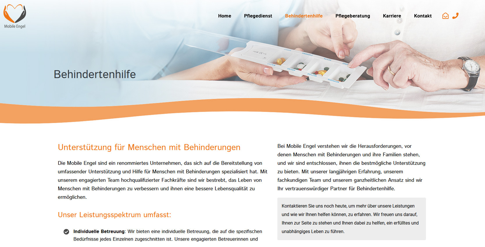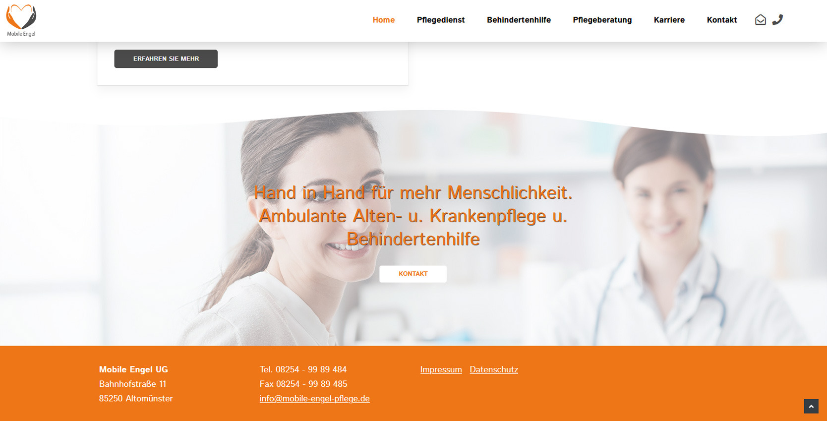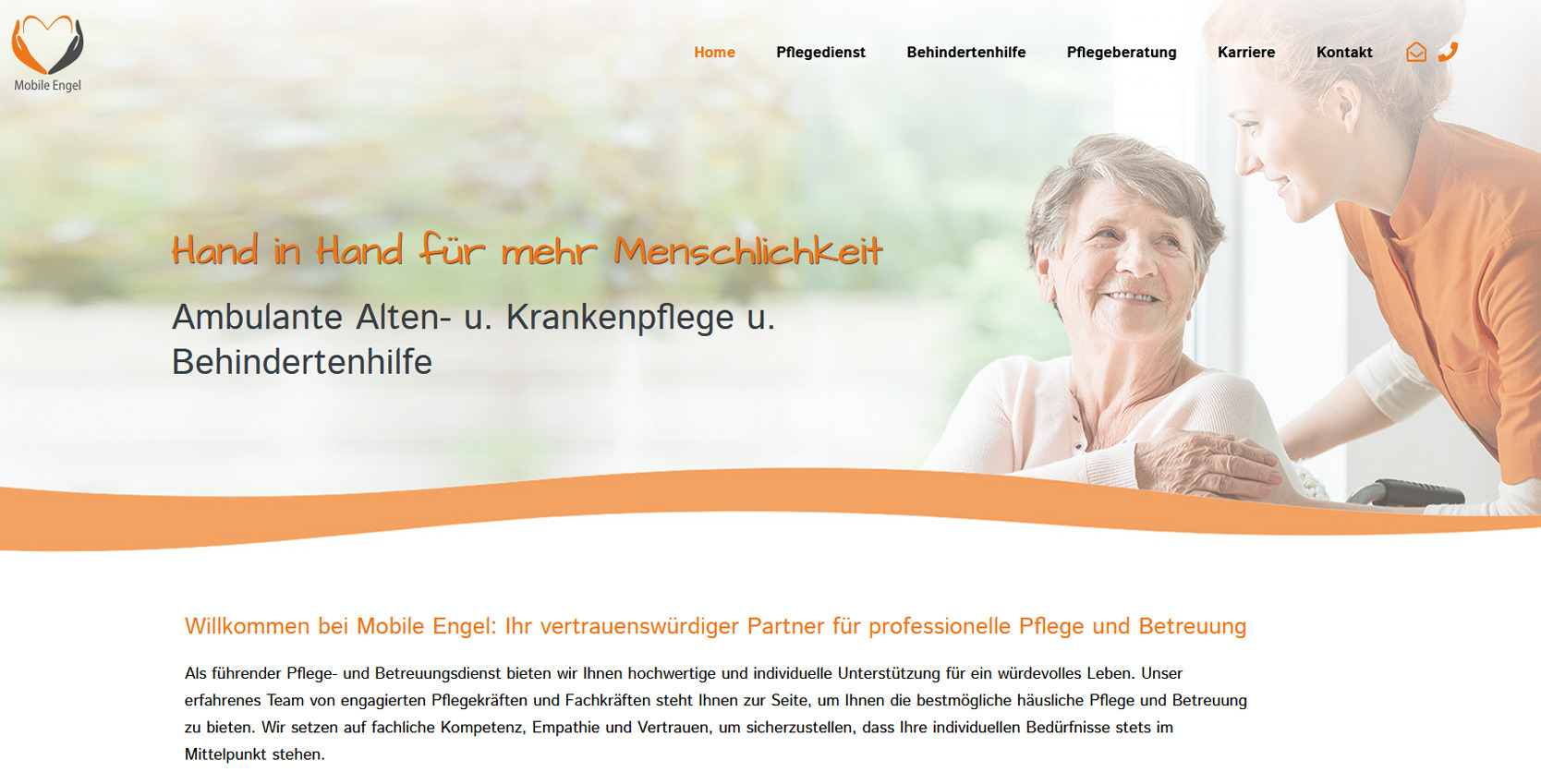 Mobile Engel Pflege ist ein ambulanter Pflegedienst in Altomünster, der pflegebedürftige Menschen in ihrem vertrauten Zuhause unterstützt. Das Team begleitet Senioren und Hilfebedürftige mit fachlicher Kompetenz, Einfühlungsvermögen und Respekt. Ziel ist es, Selbstständigkeit zu erhalten und Angehörige im Pflegealltag zu entlasten.Die neue Website präsentiert den Pflegedienst ruhig, vertrauensvoll und übersichtlich. Besucher finden Informationen zu Pflegeleistungen, Betreuungskonzepten und Ansprechpartnern. Ziel war es, eine digitale Anlaufstelle zu schaffen, die Orientierung gibt, Vertrauen aufbaut und den ersten Kontakt erleichtert. Das Design ist freundlich, barrierearm und gut lesbar gestaltet. Klare Strukturen, ruhige Farben und eine mobil optimierte Darstellung sorgen dafür, dass sich Nutzer jeden Alters schnell zurechtfinden.