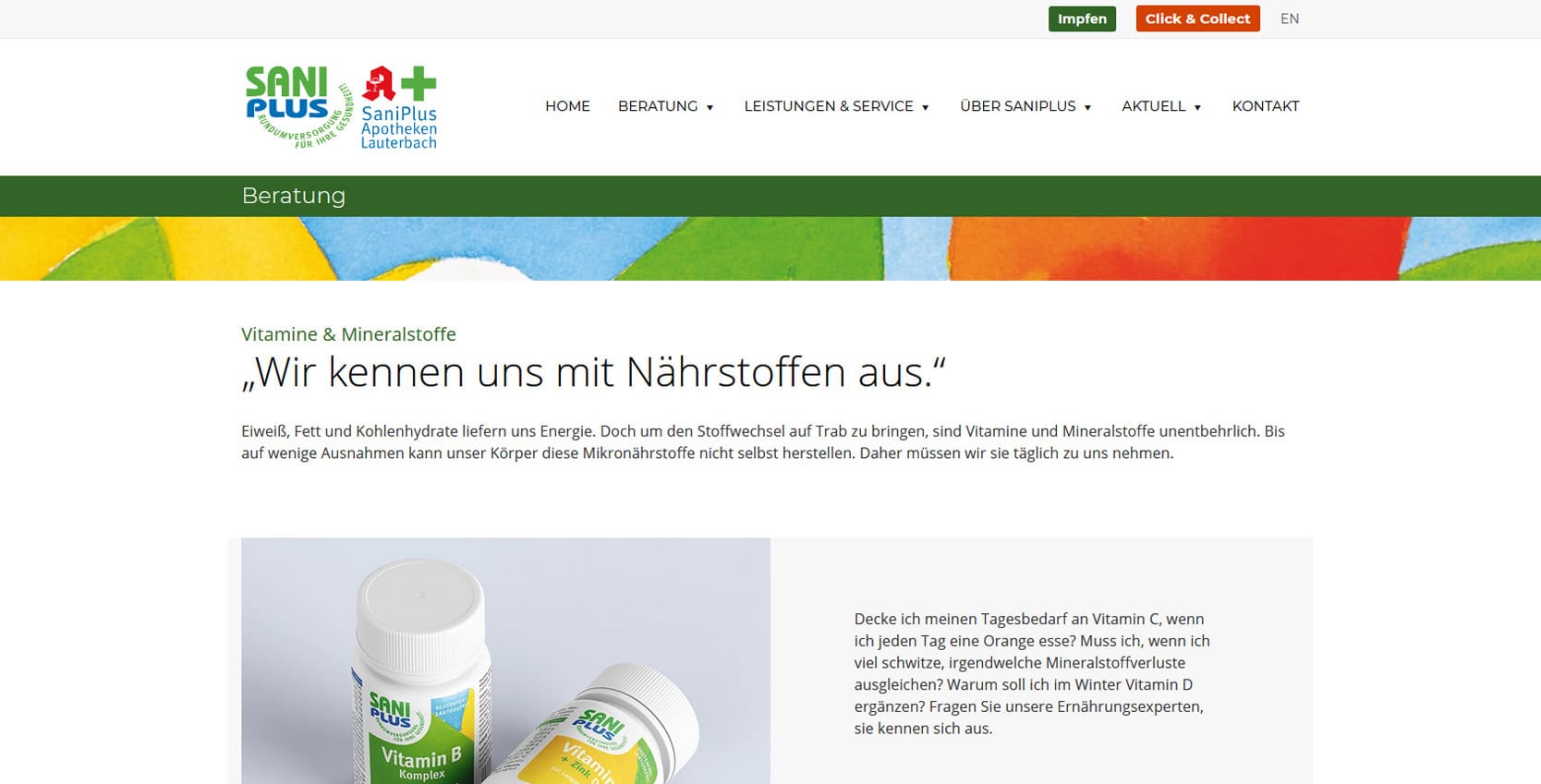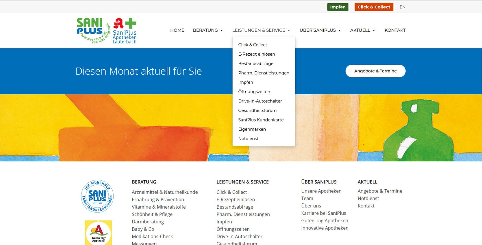 Die SaniPlus Apotheken gehören zu den größten Apothekenverbünden Münchens und vereinen modernste pharmazeutische Beratung mit digitalen Services. Unter der Marke SaniPlus sind mehrere Standorte - darunter OEZ, Pasing, Riem, Föhring und das Medicenter - zu einer starken, serviceorientierten Apothekengruppe zusammengeschlossen.Mit der neuen Website apotheken.com wurde ein zentrales Online-Portal geschaffen, das alle Apotheken unter einem Dach vereint. Besucher finden umfassende Informationen zu Leistungen, pharmazeutischer Beratung, E-Rezept, Impfungen, Click & Collect sowie individuellen Gesundheitsangeboten. Ziel war es, den hohen Anspruch an Service, Qualität und Kundennähe auch digital erlebbar zu machen. Besonderes Augenmerk lag auf Benutzerfreundlichkeit und Struktur. Kunden können Arzneimittel direkt vorbestellen, sich zu Gesundheitsthemen informieren oder Angebote abrufen. Die Seite ist komplett mobil optimiert, mehrsprachig und erfüllt die Anforderungen an Barrierefreiheit - ein Vorbild für moderne Apothekenkommunikation.