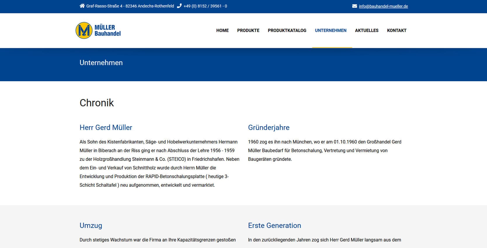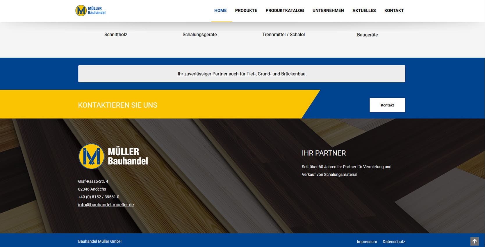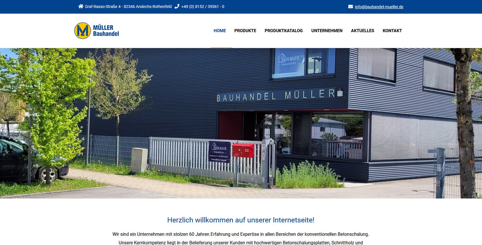 Müller Bauhandel ist seit über 60 Jahren ein kompetenter Partner für Vermietung und Verkauf von Schalungsmaterial. Das Unternehmen in Andechs beliefert Bauunternehmen, Tief- und Brückenbau sowie Handwerksbetriebe mit Betonschalungsplatten, Großflächenschalungen, Spezialschalungen, Schnittholz, Stützen und Baugeräten. Ziel der Website war es, das komplette Sortiment klar zu strukturieren und die Anfragewege zu vereinfachen.Die neue Website stellt Produktkategorien, Einsatzbereiche und Unternehmensprofil übersichtlich dar. Besucher finden schnell die passenden Materialien, technische Hinweise und Kontaktmöglichkeiten. Das Ergebnis ist ein moderner Auftritt, der Verfügbarkeit, Beratung und Zuverlässigkeit sichtbar macht und den Vertrieb unterstützt.