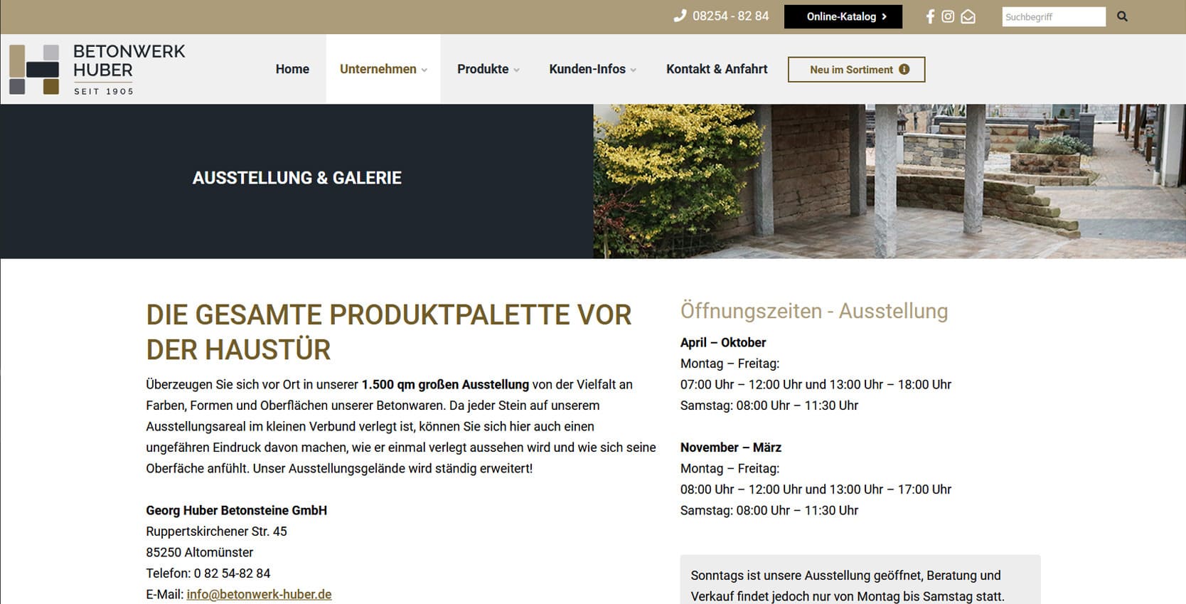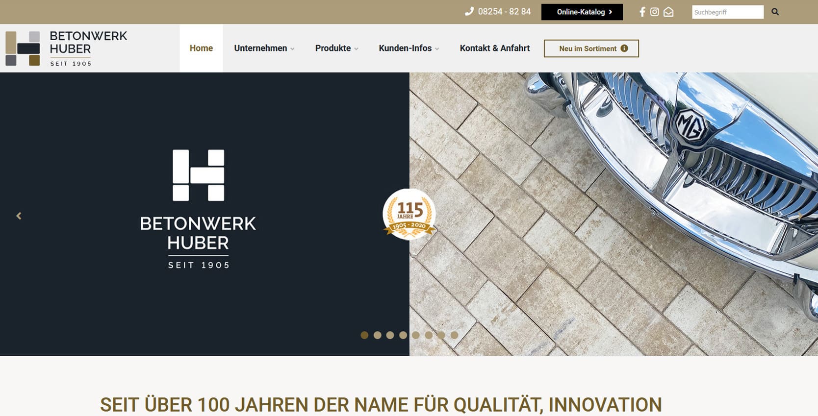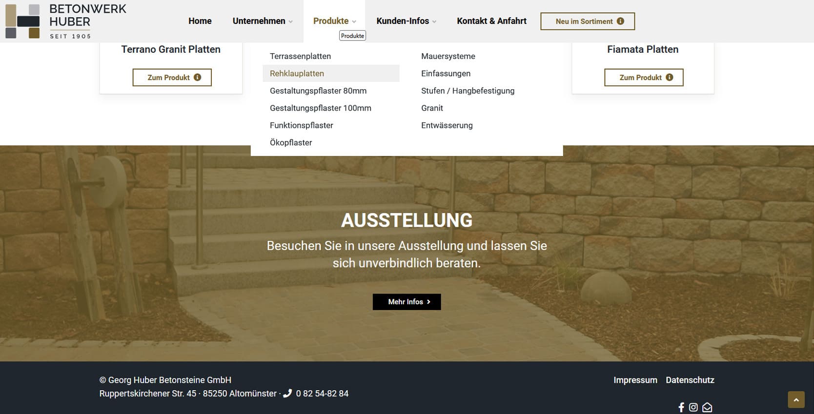 Seit über 100 Jahren steht das Betonwerk Huber in Altomünster für Qualität, Innovation und Fortschritt in Sachen Betonwaren. Mit der neuen Website wurde eine digitale Plattform geschaffen, die die breite Produktpalette und die lange Tradition des Familienunternehmens modern präsentiert. Ziel war es, die Stärken von Betonwerk Huber sichtbar zu machen und sowohl Privatkunden als auch Geschäftspartnern eine klare Übersicht zu bieten.Die Website kombiniert ein klares, funktionales Design mit einer intuitiven Struktur. Besucher finden schnell Informationen zu Produkten wie Terrassenplatten, Pflaster, Mauersystemen oder Granit. Gleichzeitig vermittelt die Seite das Selbstverständnis des Unternehmens - ein starker Partner mit Erfahrung über fünf Generationen. Besonders wichtig war eine einfache Bedienung und schnelle Auffindbarkeit relevanter Informationen. Produktübersichten, technische Daten und Kontaktmöglichkeiten sind übersichtlich eingebunden. Damit wird die Website nicht nur zu einer digitalen Visitenkarte, sondern auch zu einem Service-Tool für Kunden.