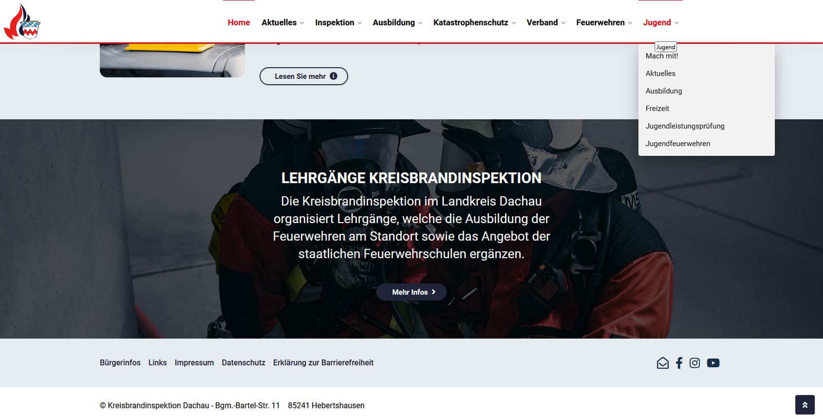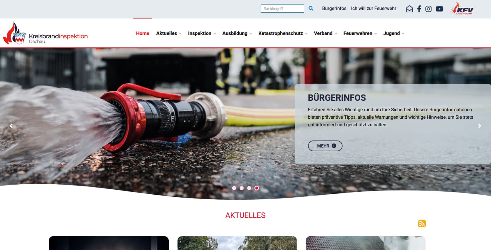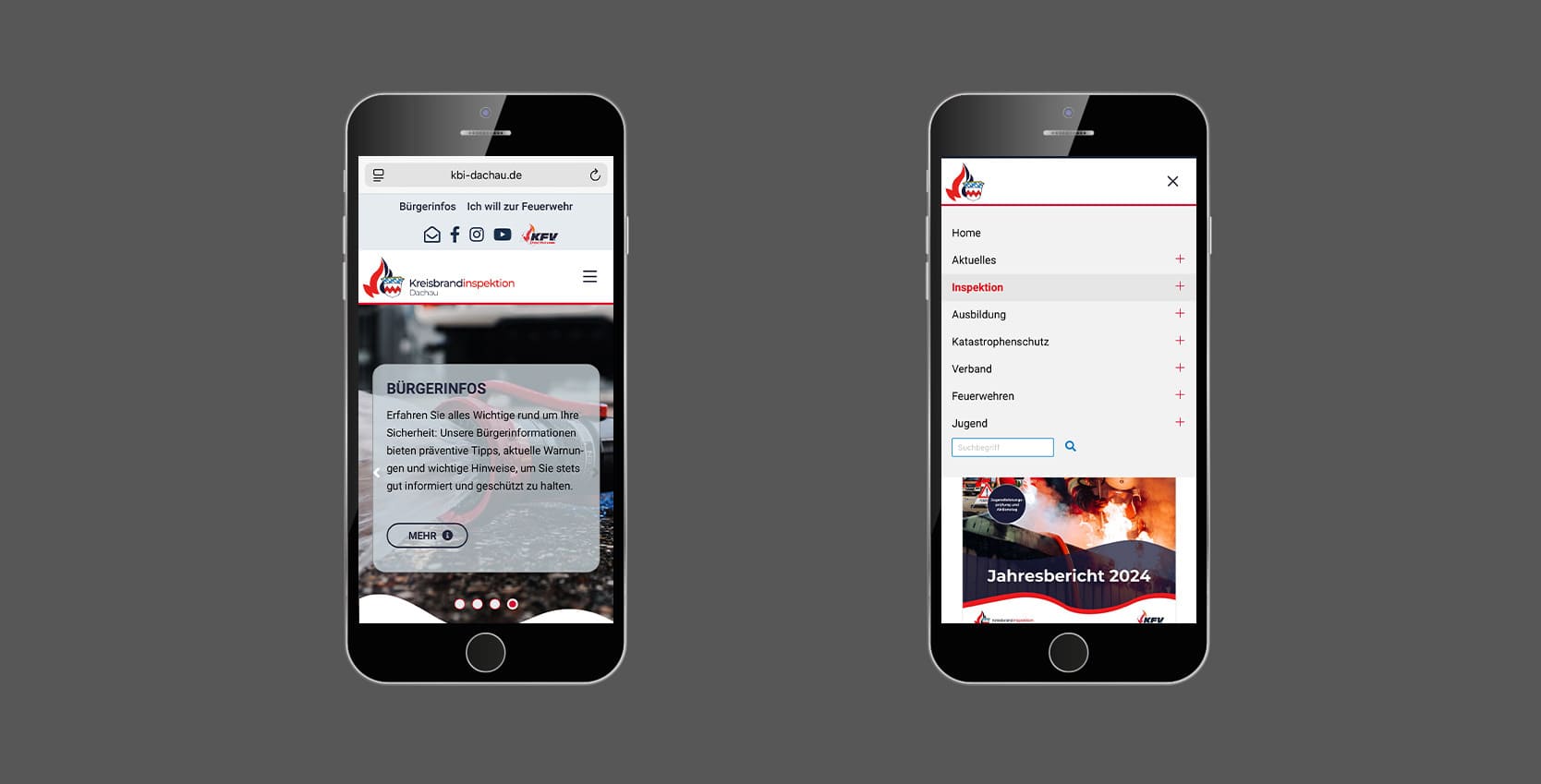 Die Kreisbrandinspektion Dachau (KBI) ist die zentrale Koordinations- und Informationsstelle für alle Feuerwehren im Landkreis Dachau. Sie unterstützt die örtlichen Kommandanten, plant Aus- und Fortbildungen, organisiert Großübungen und ist Ansprechpartner für Katastrophenschutz und Öffentlichkeitsarbeit.Mit der neuen Website entstand ein modernes Informationsportal, das Bürger, Feuerwehrangehörige und Behörden gleichermaßen anspricht. Besucher finden aktuelle Einsatzberichte, Termine, Lehrgangsübersichten, Fahrzeugdaten und umfassende Informationen zu den Feuerwehren im Landkreis. Ziel war es, eine Plattform zu schaffen, die Transparenz, Struktur und Einsatznähe digital vereint. Die Seite ist klar gegliedert und mobil optimiert, sodass auch Einsatzkräfte unterwegs auf aktuelle Inhalte zugreifen können. Zudem bietet sie eine Dokumentenverwaltung für interne Abläufe, wodurch Verwaltung und Kommunikation effizienter werden.