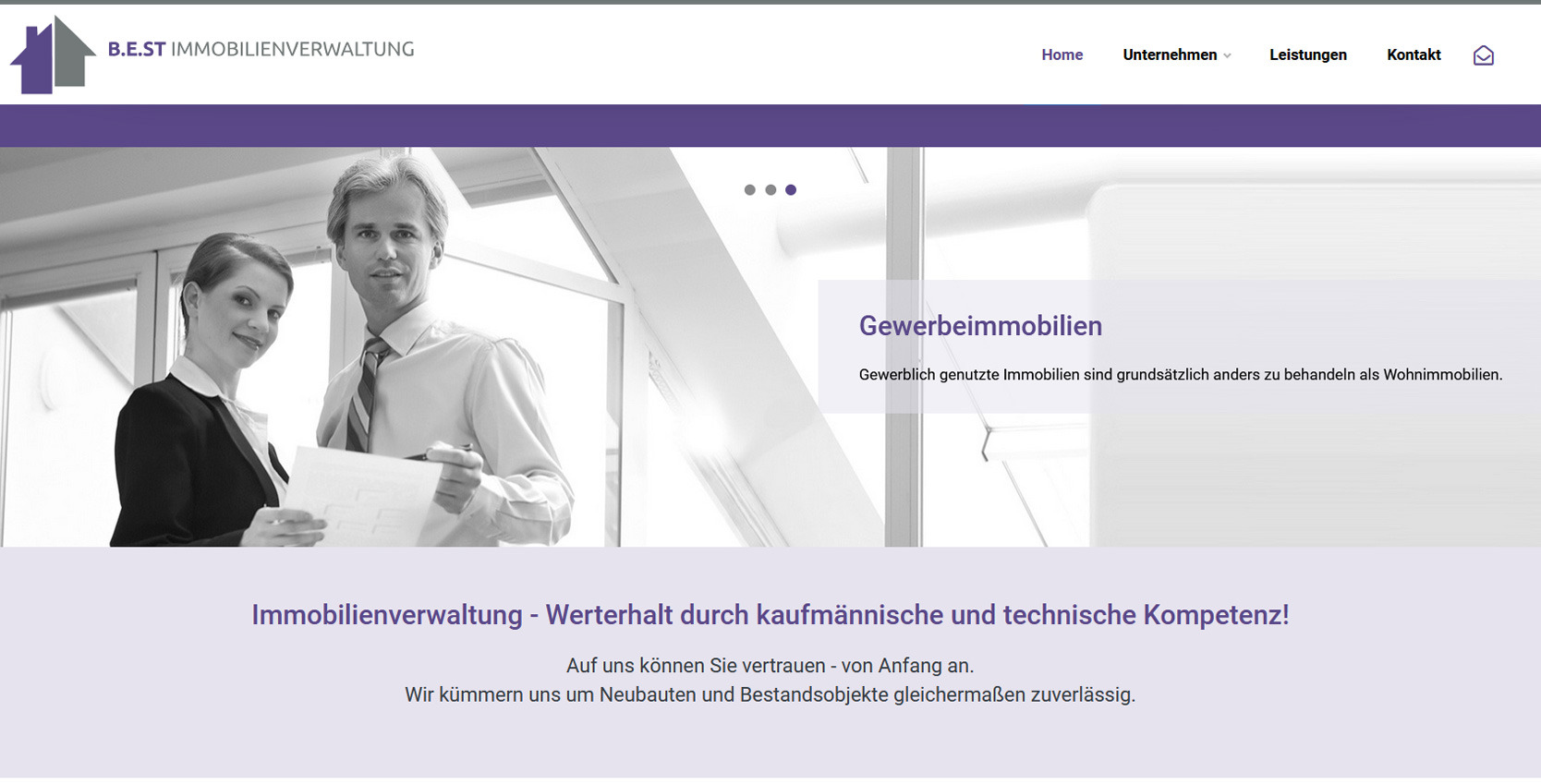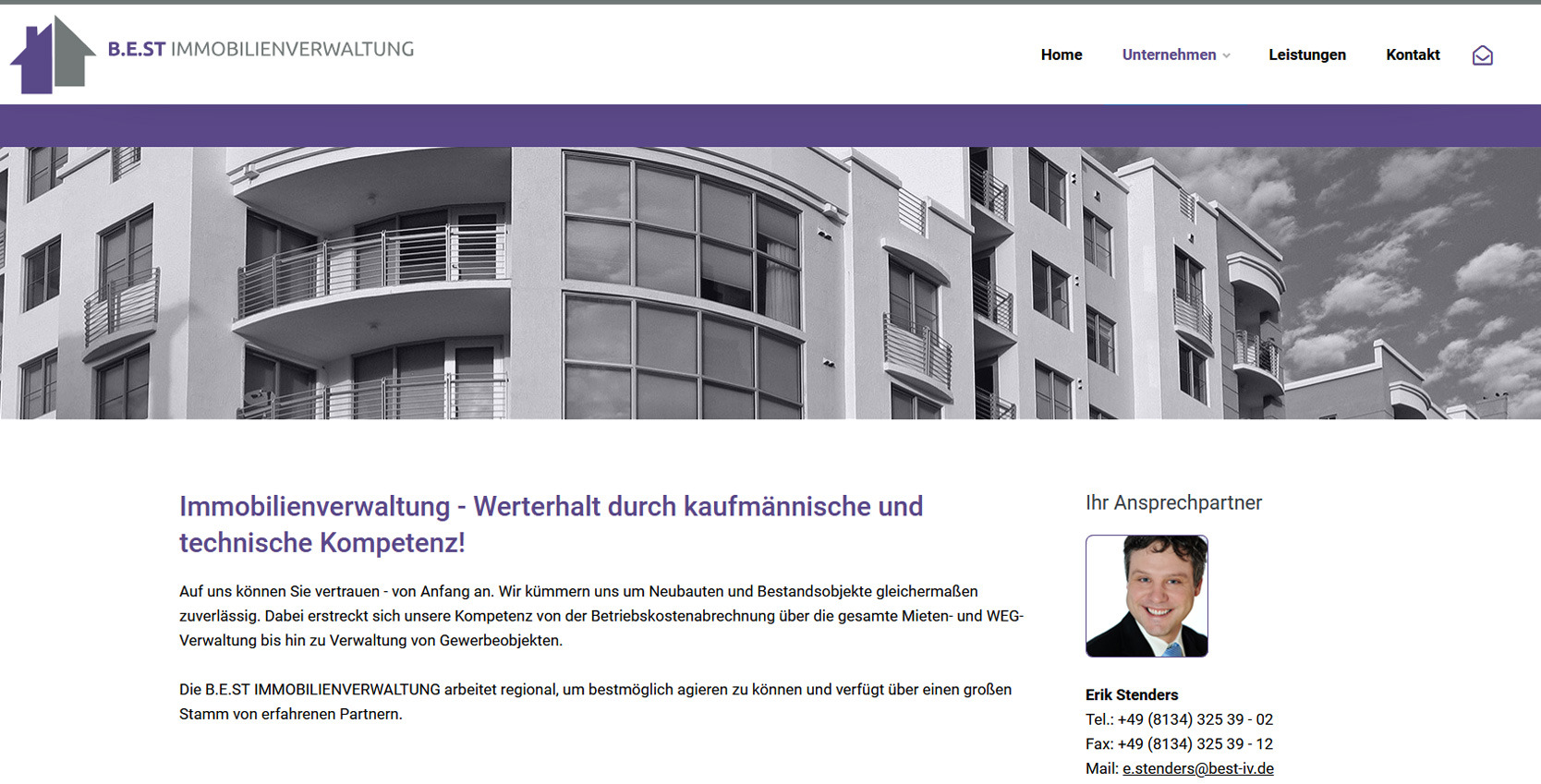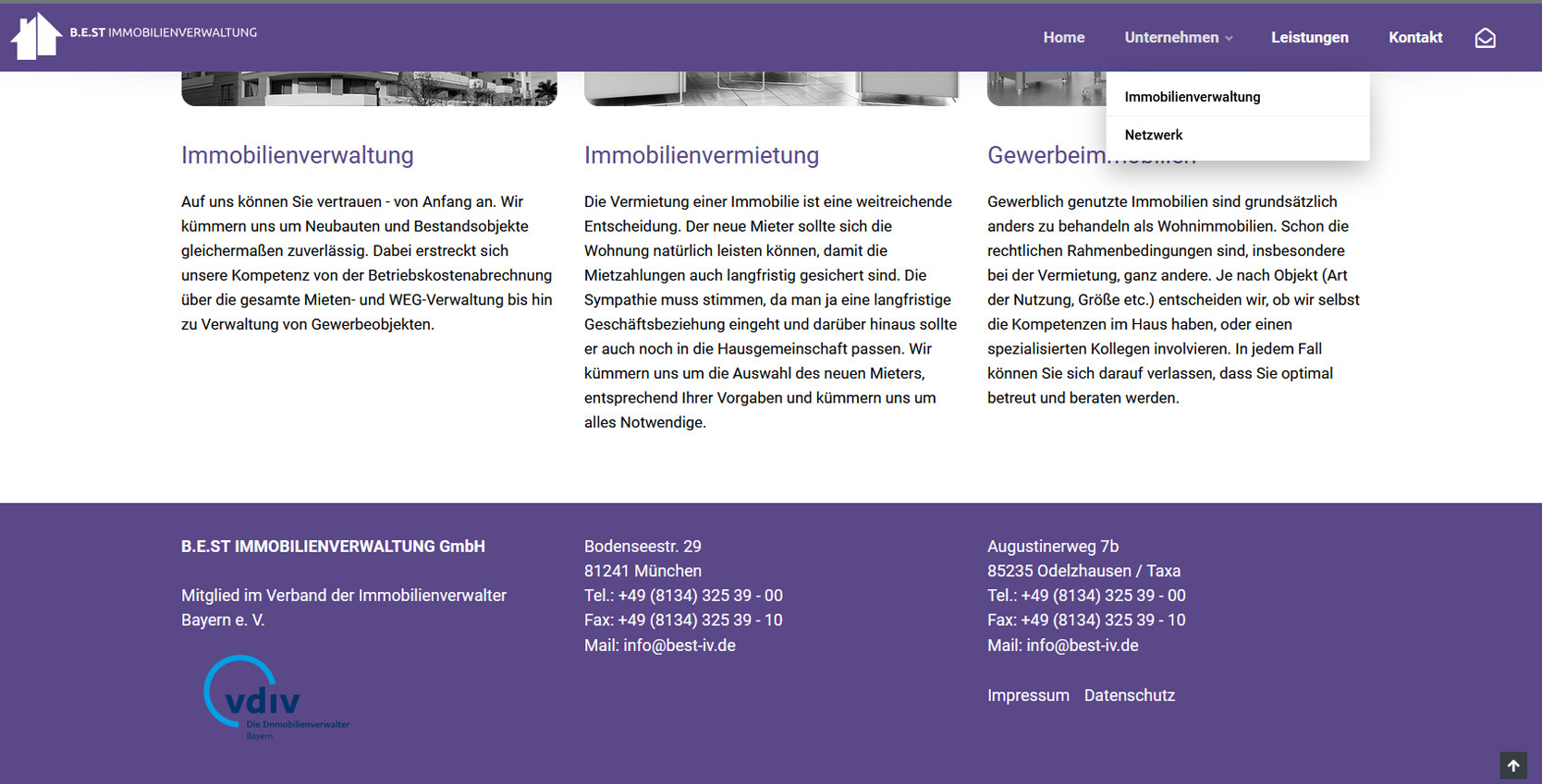 BEST Immobilienverwaltung ist ein professioneller Dienstleister für die Verwaltung von Wohn- und Gewerbeimmobilien in München. Das Unternehmen betreut Eigentümergemeinschaften, Mietobjekte und Sonderimmobilien und steht für strukturierte Abläufe, Transparenz und persönliche Betreuung. Ziel ist eine langfristige Werterhaltung der Immobilien und eine verlässliche Verwaltung im Alltag.Die neue Website präsentiert BEST Immobilienverwaltung klar, sachlich und übersichtlich. Besucher finden Informationen zu Verwaltungsleistungen, Ansprechpartnern und Leistungsmodellen. Ziel war es, die Professionalität und Verlässlichkeit des Unternehmens digital sichtbar zu machen und Eigentümern eine einfache Orientierung zu bieten. Das Design ist reduziert, seriös und funktional aufgebaut. Klare Strukturen, gut lesbare Texte und eine mobil optimierte Darstellung sorgen für ein professionelles Nutzererlebnis, das Vertrauen schafft und den Zugang zu Informationen erleichtert.