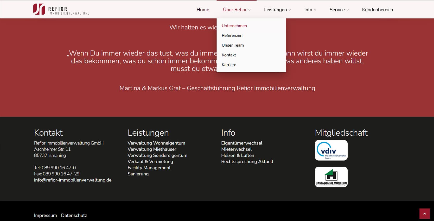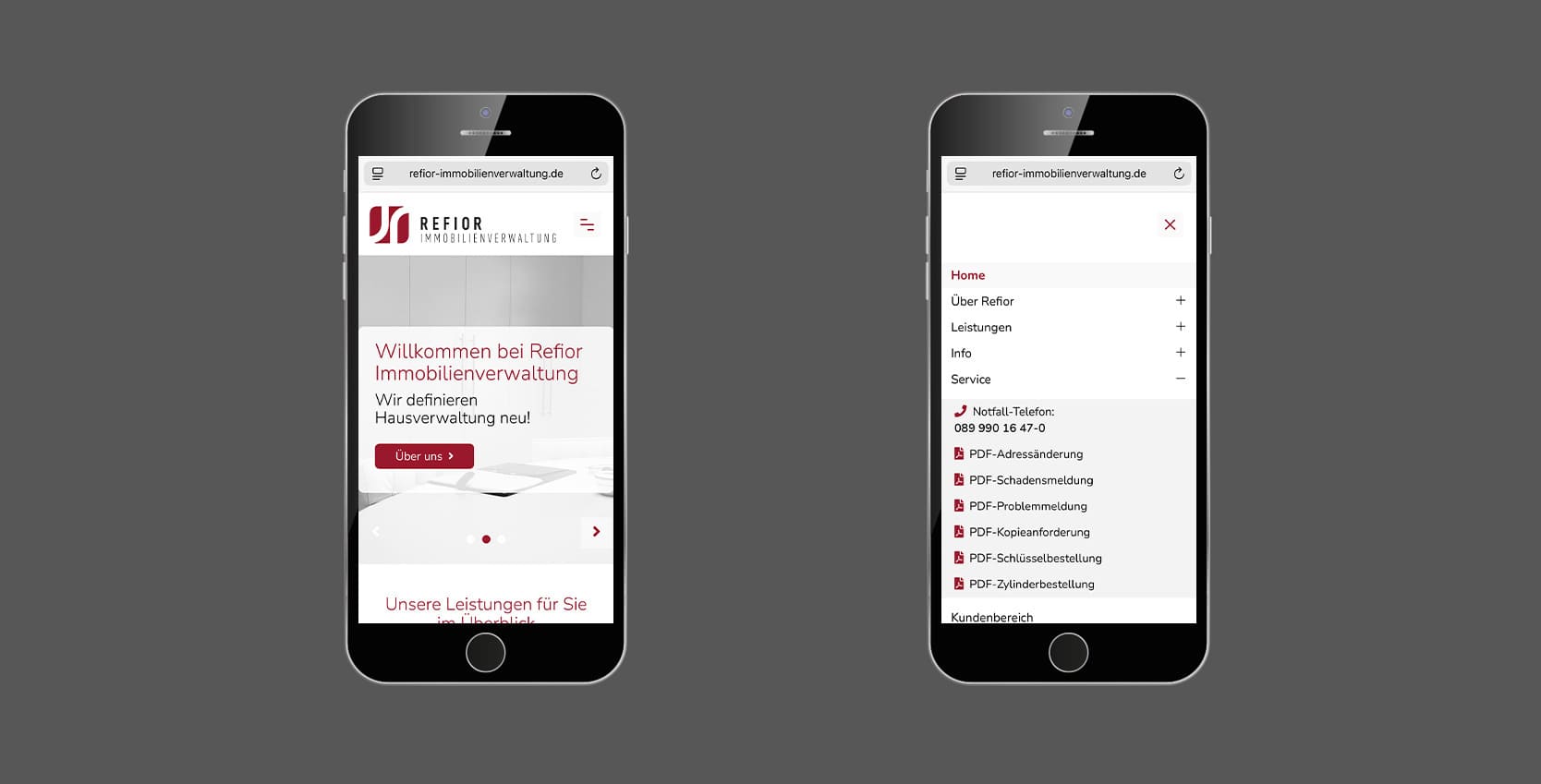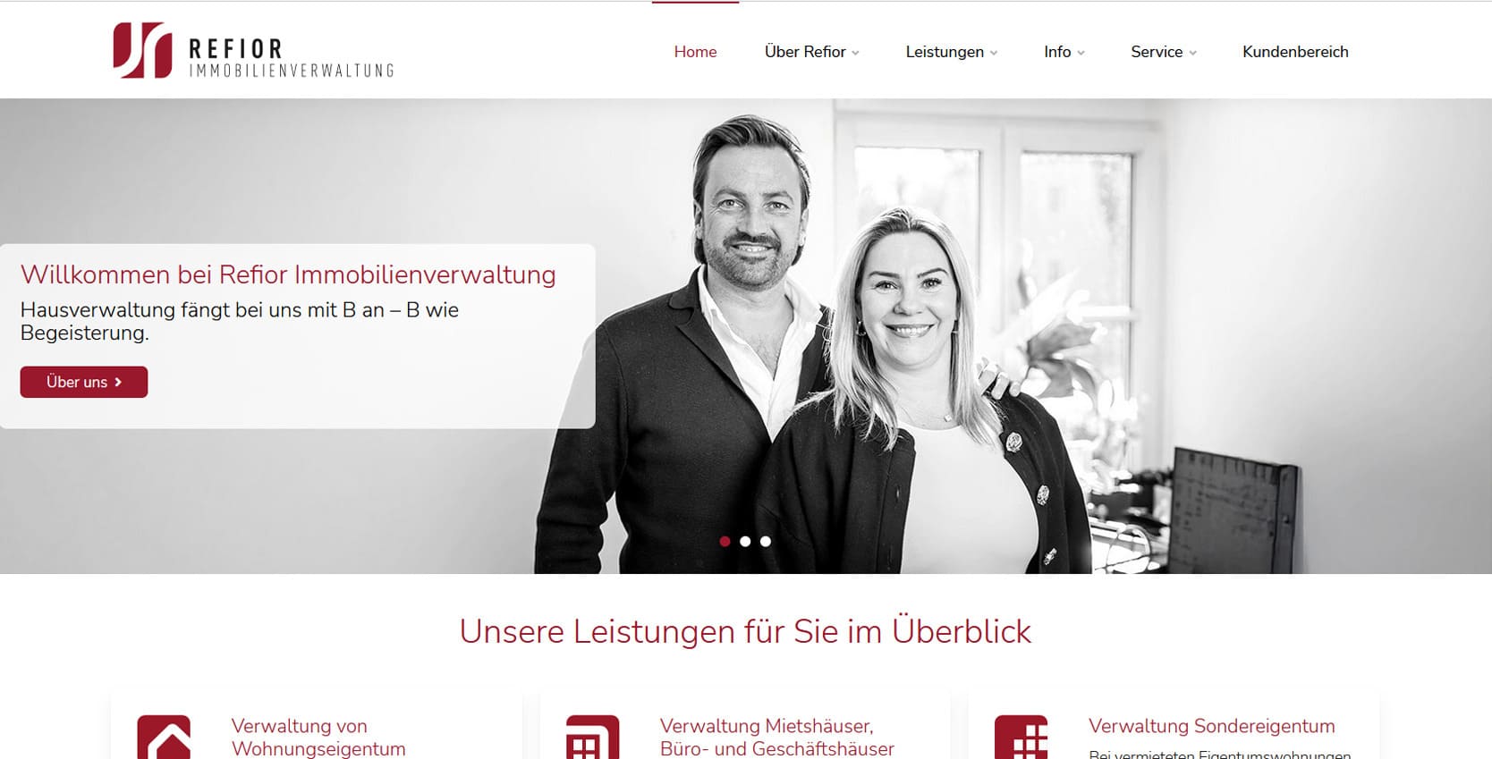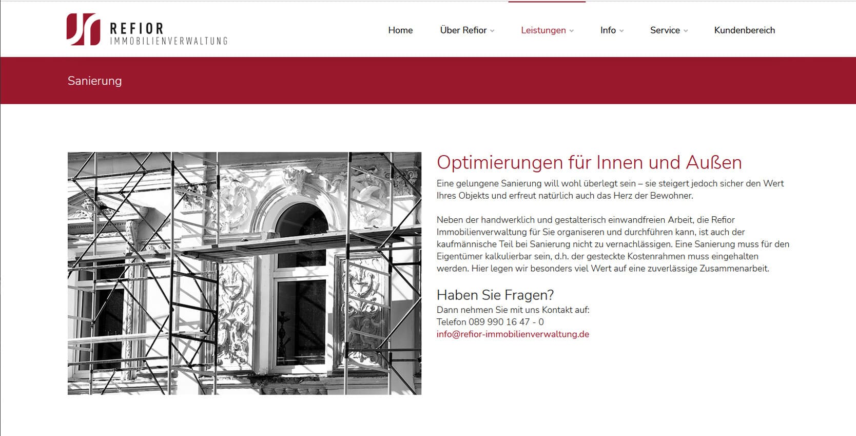 Die Refior Immobilienverwaltung GmbH ist seit vielen Jahren ein verlässlicher Partner für Wohnungseigentümer, Vermieter und Immobilieninvestoren im Großraum München. Das Unternehmen steht für engagierte, nachhaltige und zukunftsorientierte Hausverwaltung - mit dem Anspruch, Werte zu erhalten und Potenziale zu steigern.Die neue Website präsentiert das Unternehmen modern, strukturiert und mit klarer Serviceorientierung. Besucher finden umfassende Informationen zu den Kernleistungen - von der Verwaltung von Wohnungseigentum und Mietshäusern über Facility Management bis hin zu Sanierung und Verkauf. Ziel war es, die Professionalität und Transparenz der Verwaltung digital erlebbar zu machen und Eigentümern wie Mietern einen schnellen Zugang zu wichtigen Informationen zu bieten. Besonderer Wert wurde auf Nutzerfreundlichkeit gelegt: Über den Kundenbereich und verschiedene Service-Downloads können Anliegen wie Adressänderungen, Schadensmeldungen oder Schlüsselbestellungen direkt online eingereicht werden. So wird die Website zum effizienten Service-Tool für alle Beteiligten.