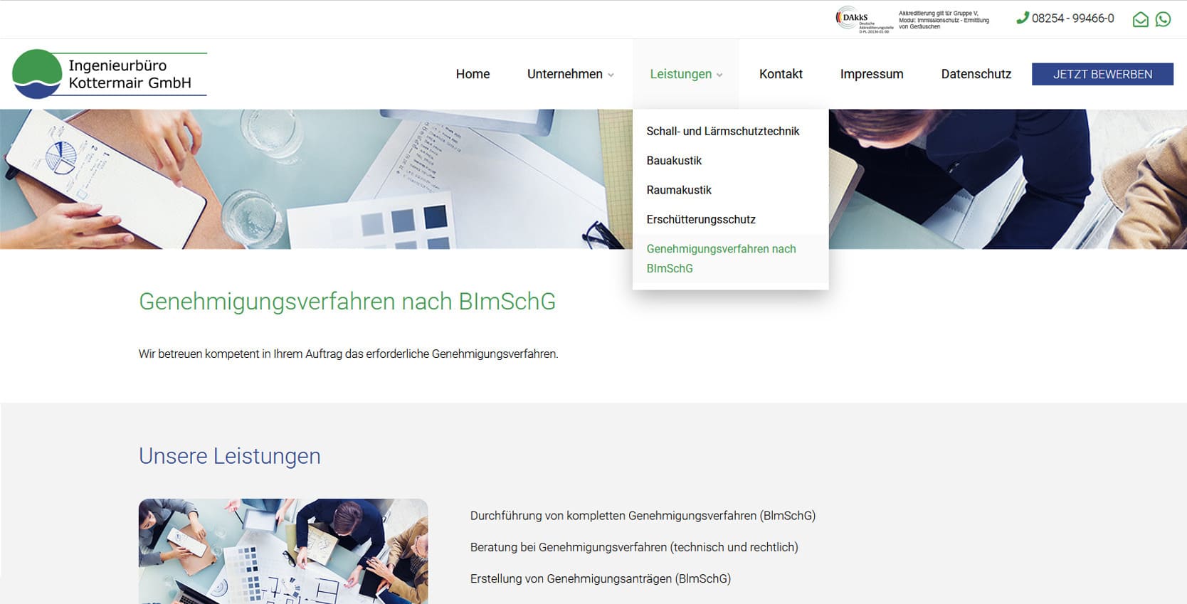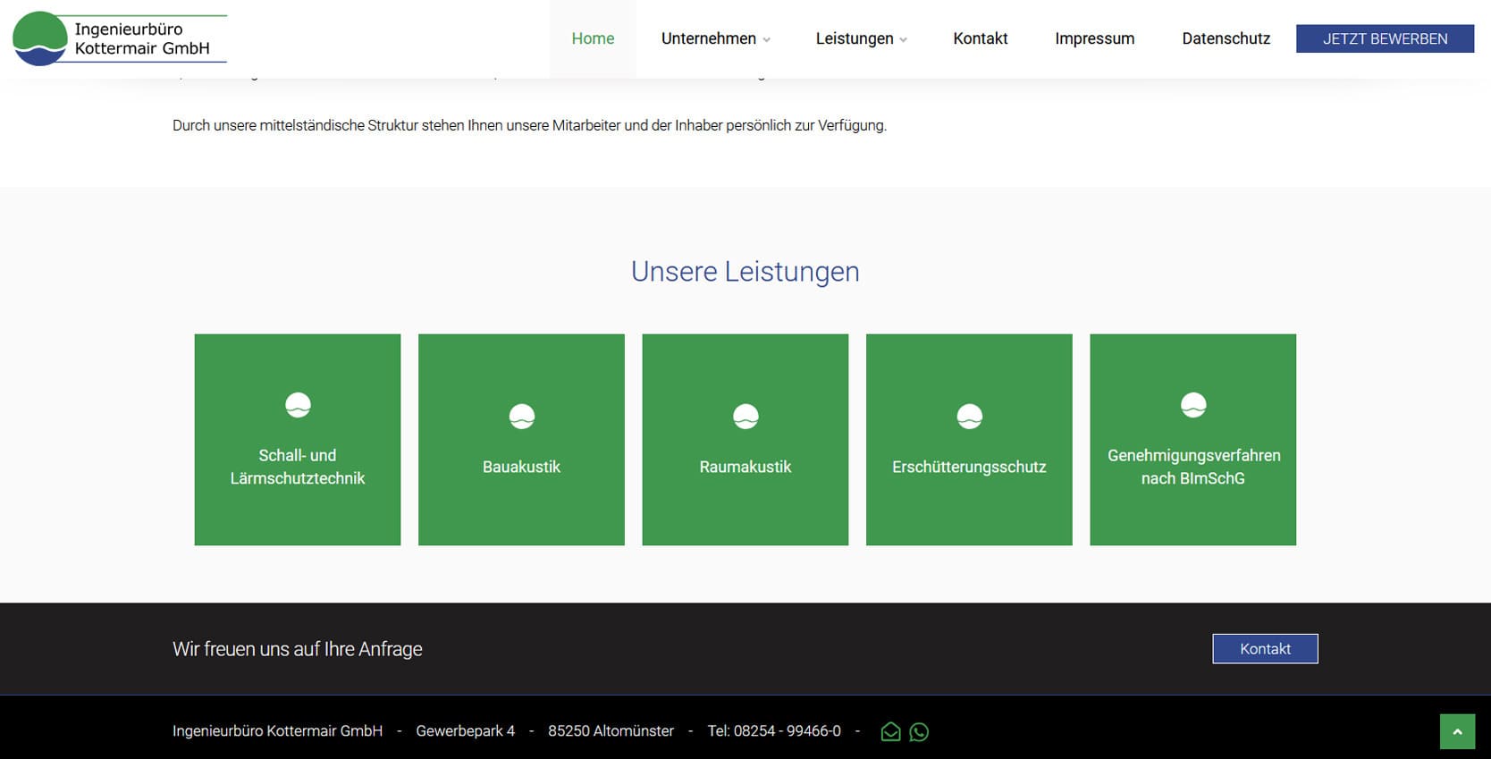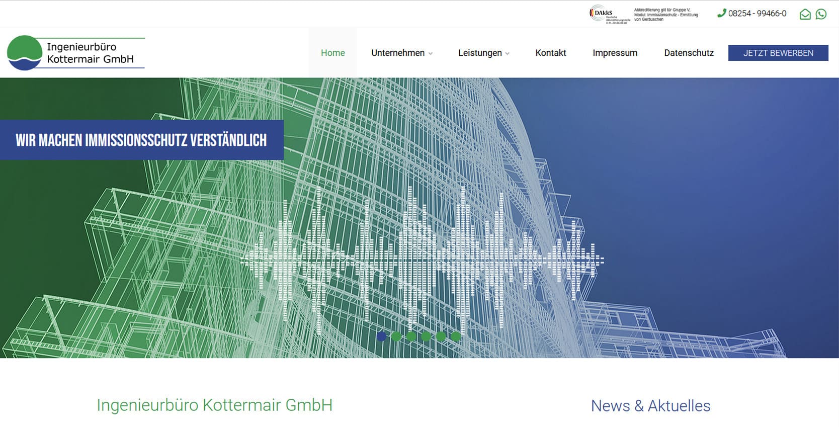 Das Ingenieurbüro Kottermair GmbH ist seit mehreren Jahrzehnten auf den Bereich Immissionsschutz spezialisiert. Als nach DIN EN ISO/IEC 17025:2018 akkreditiertes und gemäß §29b BImSchG bekanntgegebenes Messinstitut steht das Unternehmen für höchste Qualität, Präzision und Unabhängigkeit.Die neue Website wurde entwickelt, um das umfassende Leistungsspektrum in den Bereichen Schall- und Lärmschutztechnik, Bauakustik, Raumakustik, Erschütterungsschutz und Genehmigungsverfahren übersichtlich und fachlich fundiert zu präsentieren. Ziel war es, die technische Kompetenz des Unternehmens digital sichtbar zu machen und eine klare, vertrauensvolle Informationsplattform für Kunden, Behörden und Partner zu schaffen. Neben der fachlichen Tiefe sorgt das moderne Design für eine strukturierte Benutzerführung. Besucher finden schnell relevante Informationen, Teamvorstellungen oder aktuelle Stellenangebote. Die Seite ist vollständig mobil optimiert und spiegelt die Werte des Unternehmens wider: Präzision, Qualität und Kundennähe.