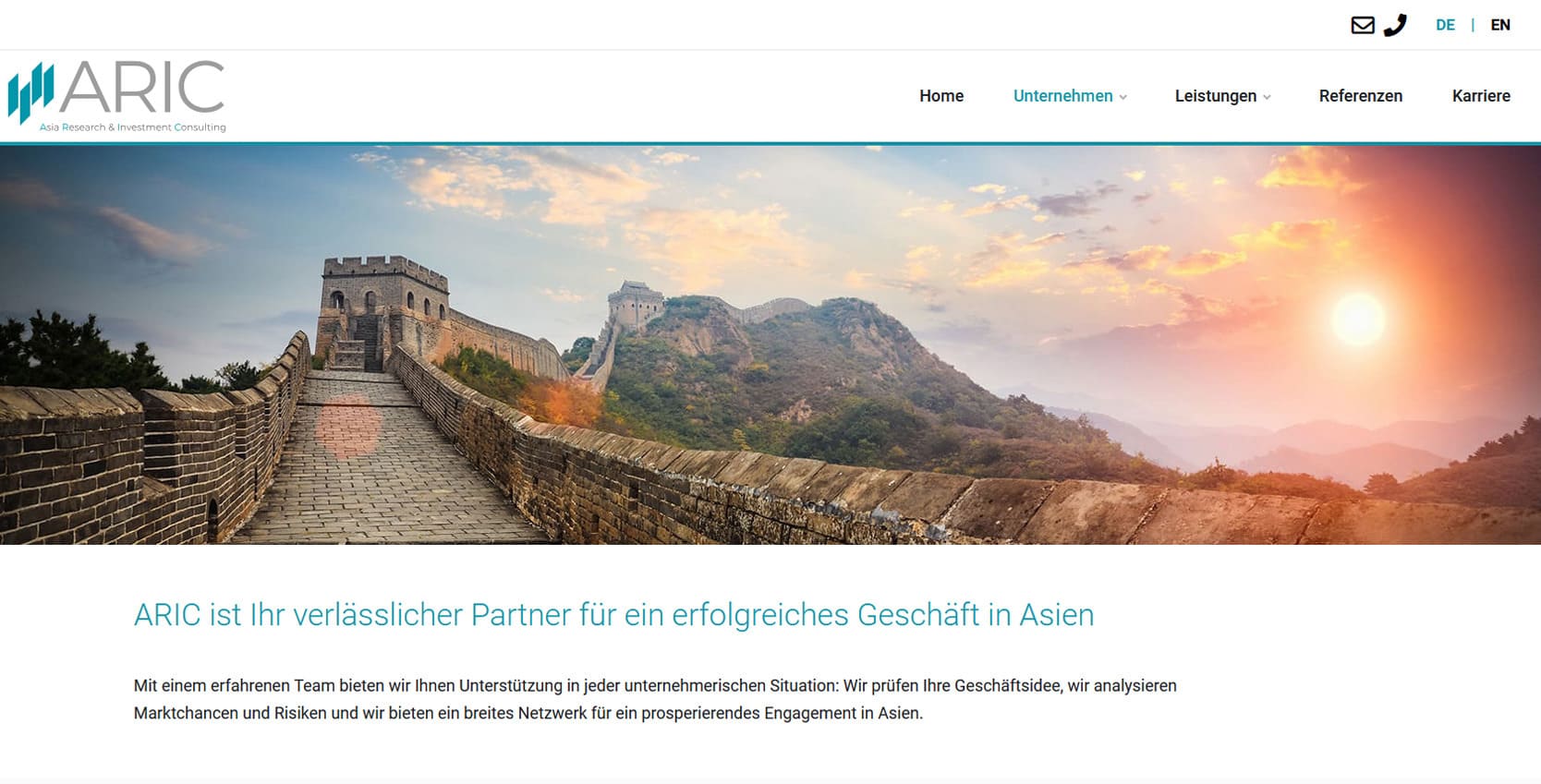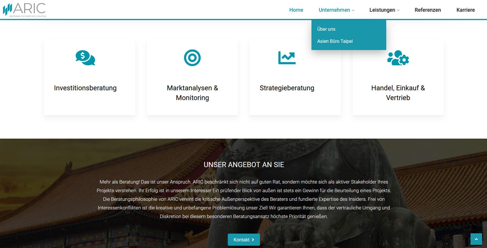 ARIC (Asia Research & Investment Consulting) unterstützt Unternehmen beim erfolgreichen Markteintritt in Asien. Mit Büros in München und Taipeh bietet das Unternehmen Investitionsberatung, Marktanalysen, Strategieberatung und Unterstützung bei Handel, Einkauf und Vertrieb.Die neue Website präsentiert die Leistungen klar strukturiert und zeigt ARIC als Brücke in die wachstumsstarken Märkte Ost- und Südostasiens. Ziel war es, Seriosität und internationale Kompetenz digital sichtbar zu machen und Unternehmen eine zentrale Anlaufstelle für Beratungs- und Investmentprojekte zu bieten. Besonderer Fokus lag auf Mehrsprachigkeit, einer seriösen Gestaltung und einfacher Nutzerführung. So finden Besucher schnell die passenden Dienstleistungen, Informationen zu Referenzen und den direkten Kontakt zu den Beratern.