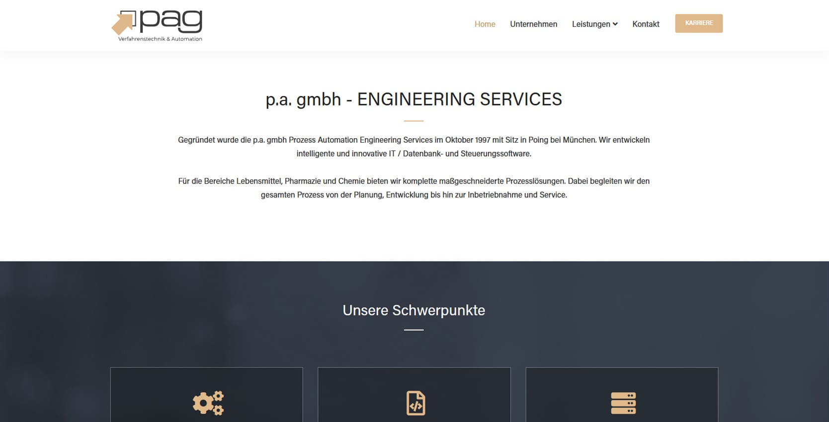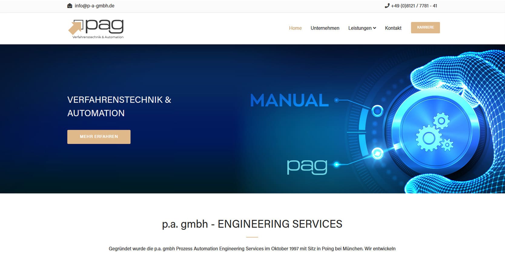 Die p.a. gmbh mit Sitz in Poing bei München ist seit 1997 ein erfahrener Partner für Prozessautomation, IT-Systeme und Datenbanklösungen. Das Unternehmen entwickelt maßgeschneiderte Software- und Prozesslösungen für Branchen wie Lebensmittel, Pharmazie und Chemie - von der Planung über die Entwicklung bis zur Inbetriebnahme.Die neue Website präsentiert die komplexen Dienstleistungen übersichtlich und klar strukturiert. Besucher finden detaillierte Informationen zu Verfahrenstechnik, Datenbanksystemen und Virtualisierung. Ergänzt wird dies durch einen Karrierebereich, der die p.a. gmbh als attraktiven Arbeitgeber darstellt. Ziel war es, Kompetenz und Innovationskraft digital sichtbar zu machen und Kunden eine zentrale Plattform für Leistungen, Referenzen und Kontaktmöglichkeiten zu bieten.