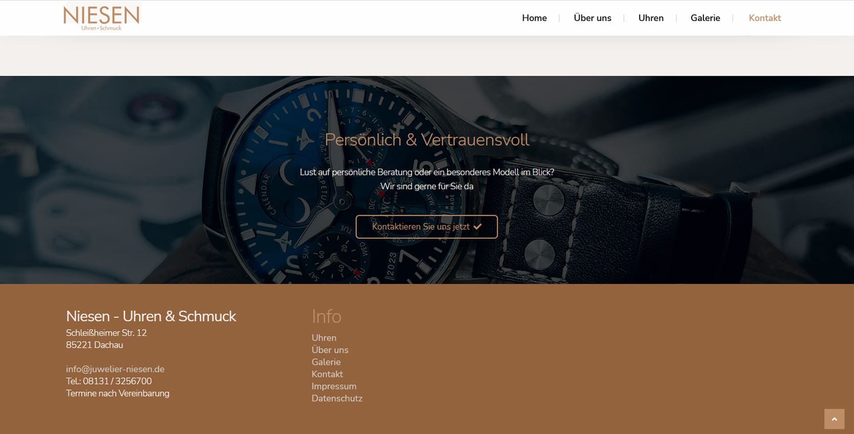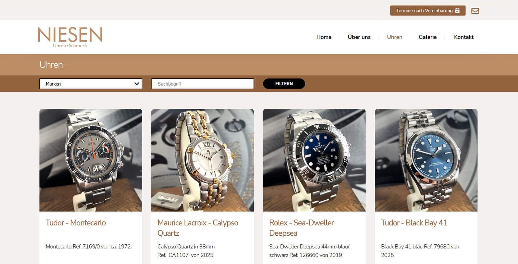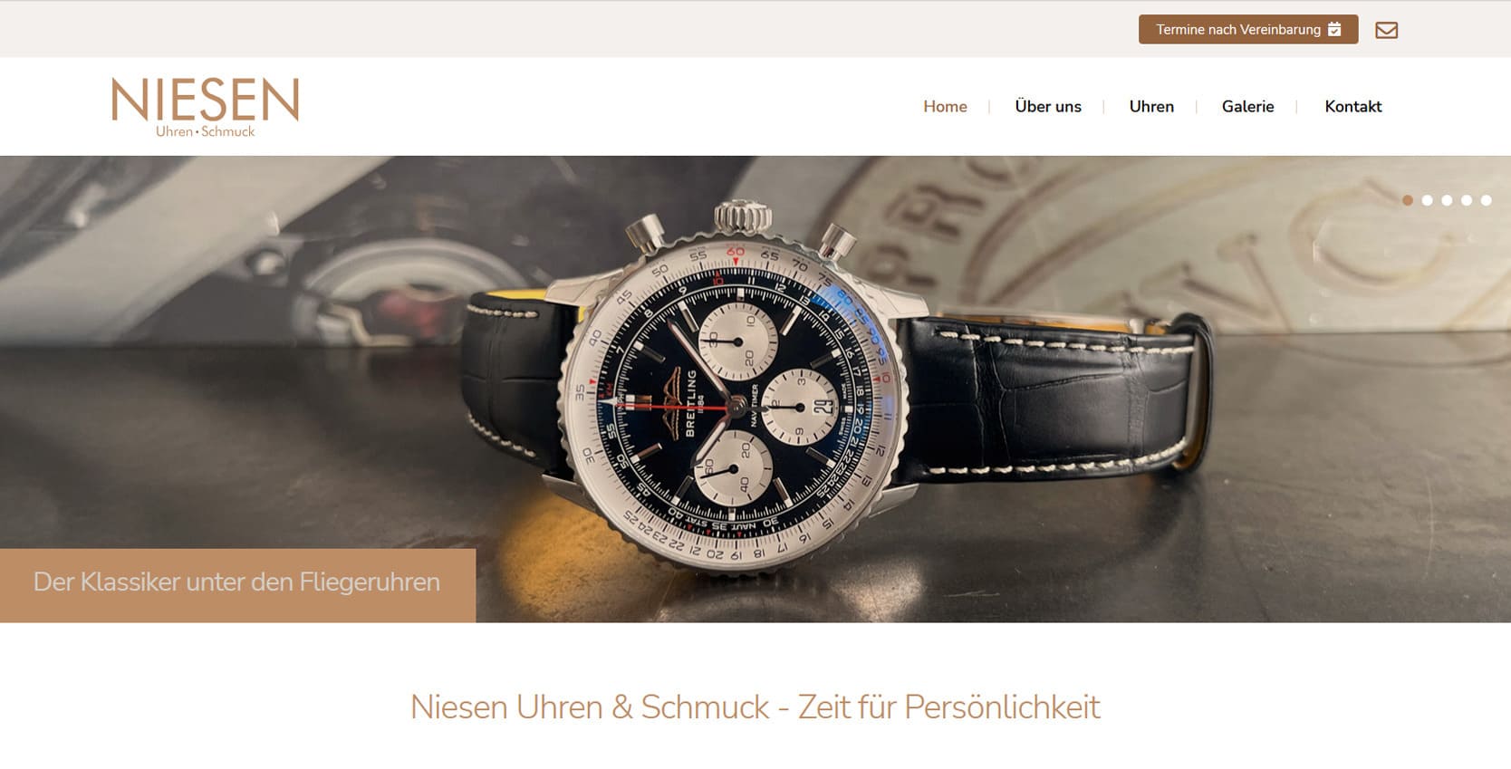 Seit über 40 Jahren steht Juwelier Niesen in Dachau für exklusive Uhren, edlen Schmuck und persönliche Beratung. Das Familienunternehmen verbindet Tradition mit modernem Anspruch und bietet eine erlesene Auswahl internationaler Top-Marken sowie seltener Sammlerstücke.Die neue Website spiegelt diesen Anspruch wider: Ein klares, elegantes Design setzt hochwertige Uhrenmodelle perfekt in Szene. Besucher finden aktuelle Neuzugänge, Informationen zu Klassikern und limitierte Raritäten - ergänzt durch eine Galerie und persönliche Einblicke in das Geschäft. Ziel war es, die Exklusivität der Produkte digital erlebbar zu machen und zugleich die persönliche Note des Hauses Niesen hervorzuheben. Kunden sollen online Inspiration finden und dennoch die persönliche Beratung im Geschäft als Herzstück erleben.