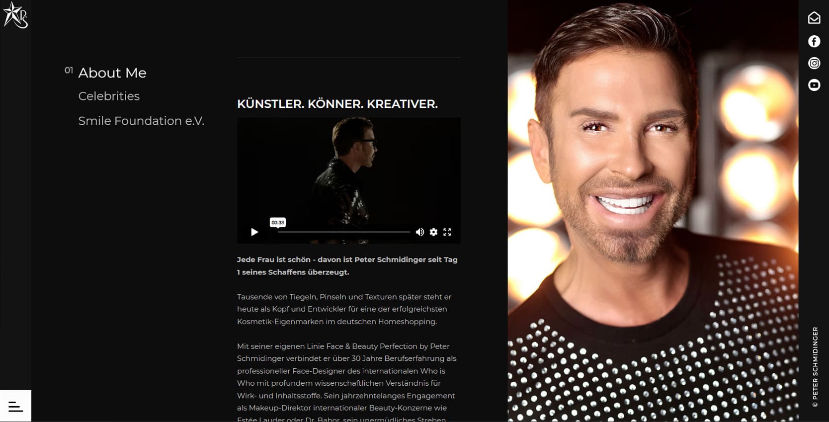 Peter Schmidinger ist einer der bekanntesten Make-up-Artists Deutschlands und steht mit seiner Kosmetikfirma und der eigenen Produktlinie für exklusive Produkte, die Schönheit und Pflege vereinen. Mit der neuen Website wurde eine Plattform geschaffen, die Marke, Produkte und Persönlichkeit modern in Szene setzt.Die Seite bietet Einblicke in die Philosophie des Unternehmens, stellt aktuelle Produkte vor und bindet Videos sowie Social-Media-Kanäle ein. Ziel war es, eine elegante und benutzerfreundliche Website zu entwickeln, die sowohl bestehende Kunden als auch neue Interessenten anspricht und den Online-Vertrieb unterstützt. Im Fokus stehen großformatige Bilder, ein klares Design und eine einfache Navigation. So können Besucher schnell Informationen zu Produkten, Markenwerten und Inspirationen finden.