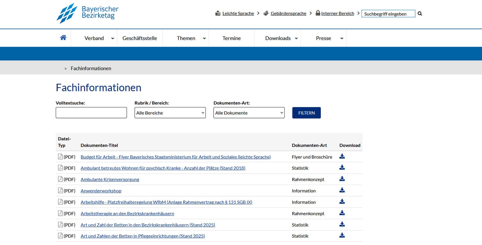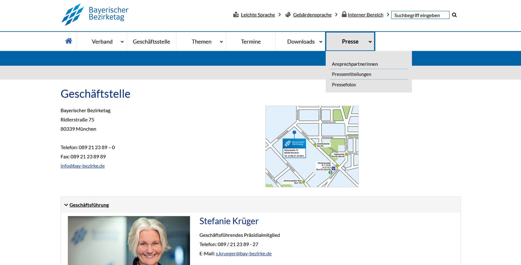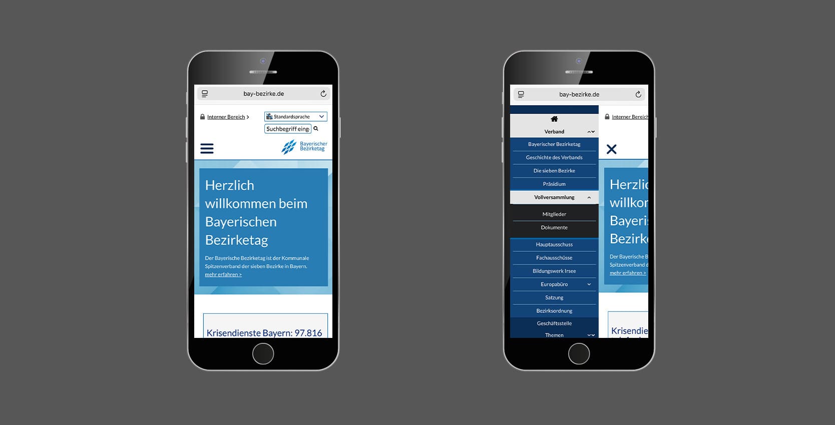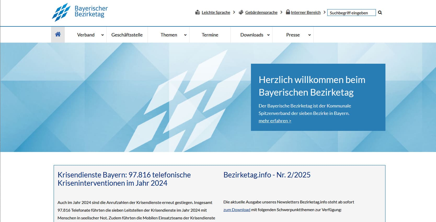 Der Bayerische Bezirketag ist der Kommunale Spitzenverband der sieben bayerischen Bezirke und vertritt deren Interessen gegenüber Staat, Gesellschaft und Öffentlichkeit. Mit der neuen Website wurde eine moderne, barrierefreie Informationsplattform geschaffen, die den hohen Anforderungen an Transparenz, Zugänglichkeit und Verwaltungskommunikation gerecht wird.Die Seite vereint umfangreiche Inhalte zu Themen wie Soziales, Gesundheit, Bildung, Kultur und Umwelt. Sie dient Bürgern, Politik, Presse und Fachkräften gleichermaßen als zentrales Informationsportal über die Aufgaben, Strukturen und Projekte der Bezirke. Besonderes Augenmerk lag auf Barrierefreiheit nach BITV-Standard - mit Angeboten in Leichter Sprache, Gebärdensprache sowie klar strukturierter Navigation. Ein internes Portal ergänzt den öffentlichen Bereich und ermöglicht den Mitgliedern und Verwaltungsstellen einen geschützten Zugriff auf Dokumente, Vorlagen und Fachaustausch. Damit verbindet die Website Öffentlichkeitsarbeit und interne Verwaltungsprozesse in einem zentralen System.
