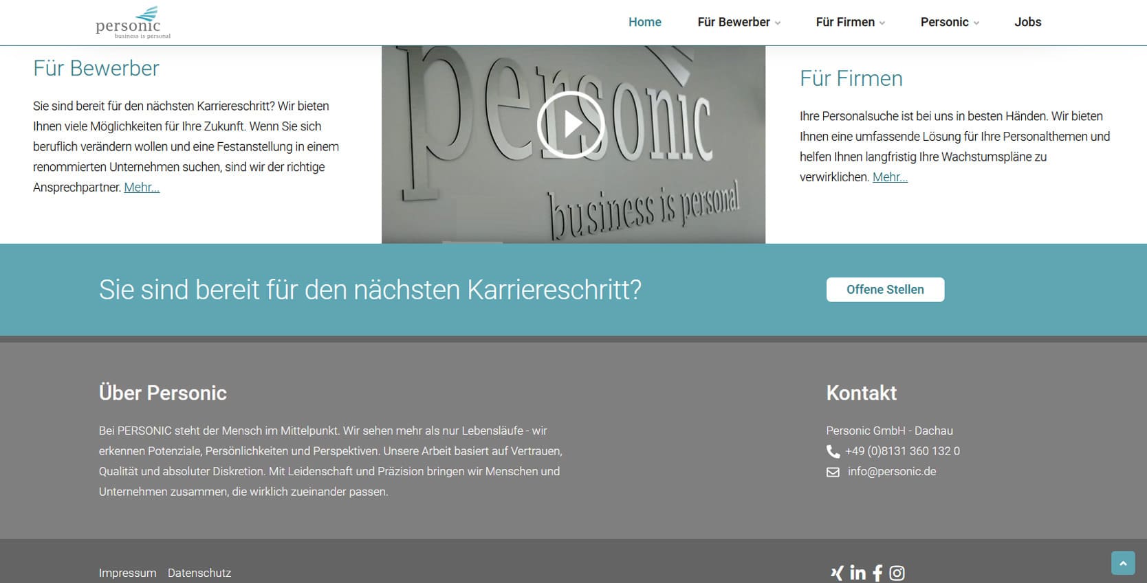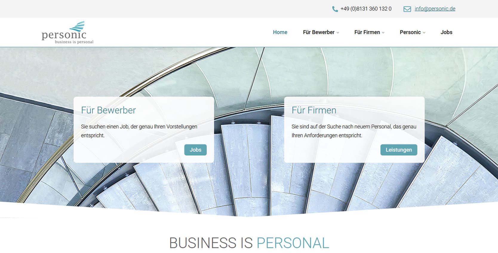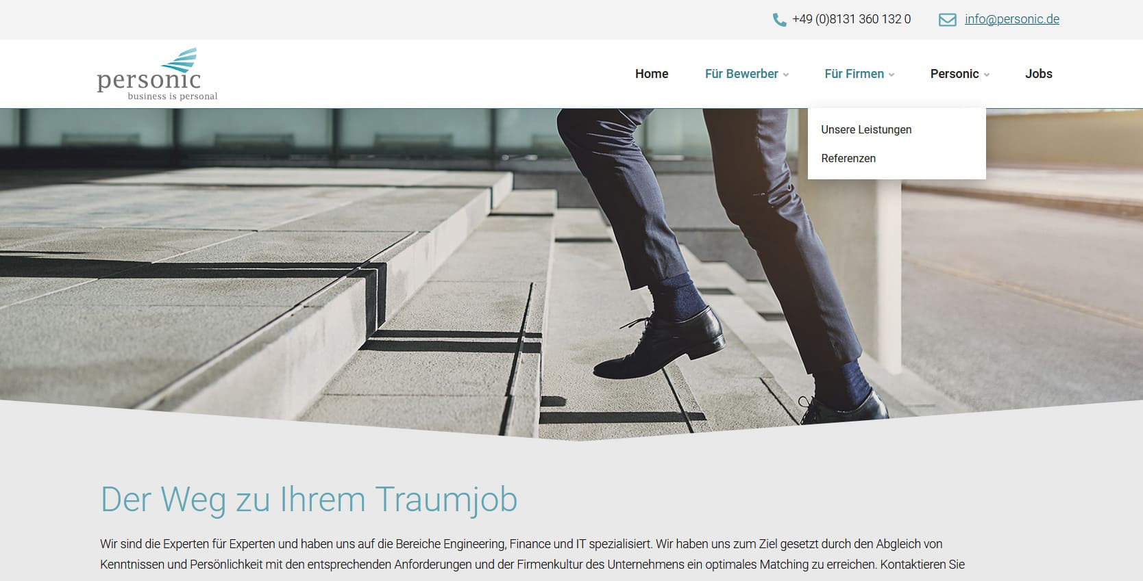Personic ist eine spezialisierte Personalberatung mit Fokus auf die Automobilbranche, Medizintechnik und IT. Das Unternehmen bringt Experten und Unternehmen erfolgreich zusammen - von der Festanstellung über Freelance-Projekte bis hin zu Executive Search.Die neue Website stellt die Leistungen klar strukturiert dar und richtet sich gleichermaßen an Bewerber wie an Firmen. Offene Stellen, Karriereberatung und der Bewerbungsprozess werden übersichtlich präsentiert. Gleichzeitig finden Unternehmen detaillierte Informationen zu Leistungen, Referenzen und Branchenkompetenz. Besonderes Augenmerk lag auf einer klaren Nutzerführung und einem modernen, professionellen Design. So können Bewerber schnell passende Stellen finden und Unternehmen unkompliziert Kontakt aufnehmen.