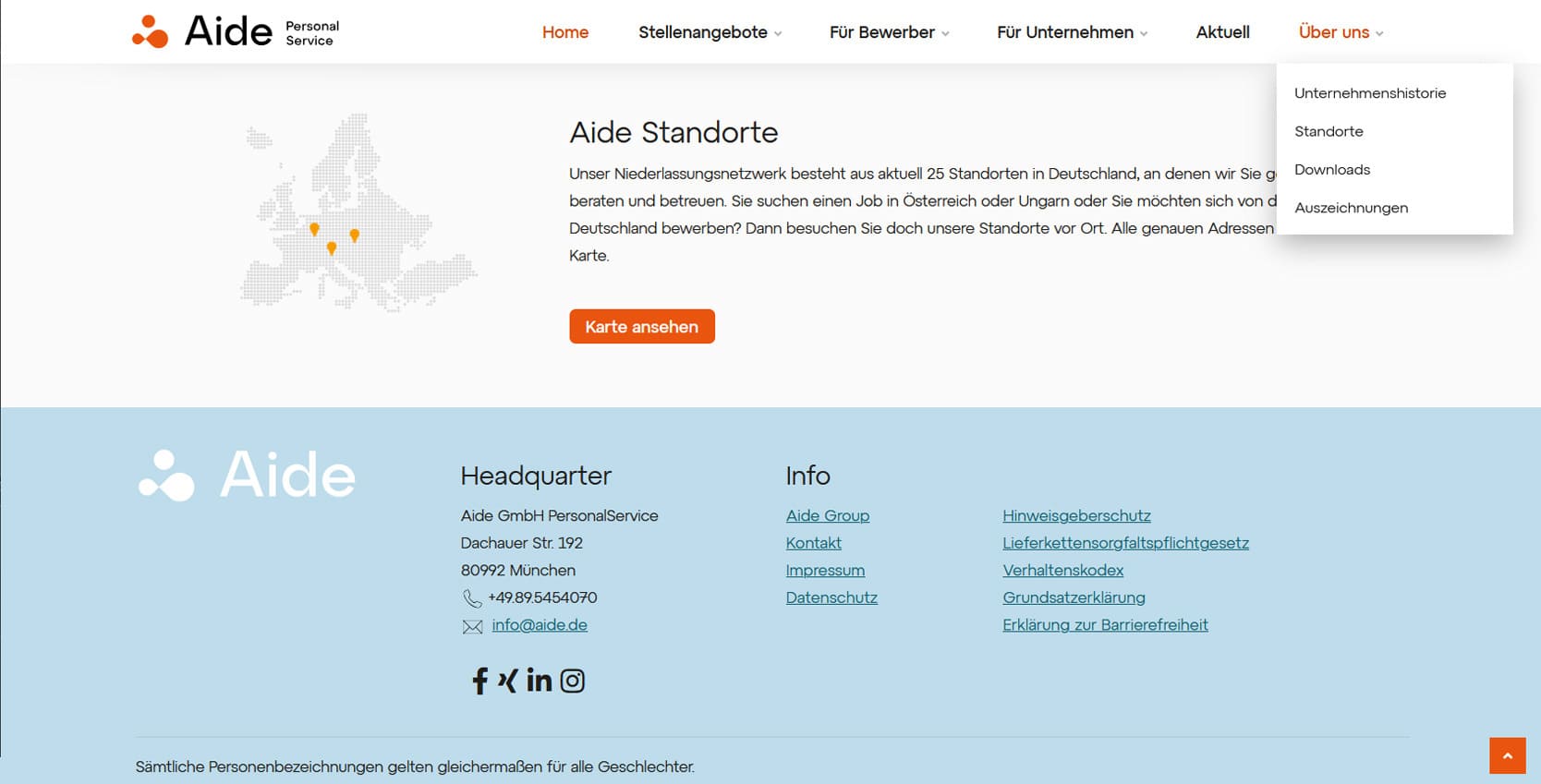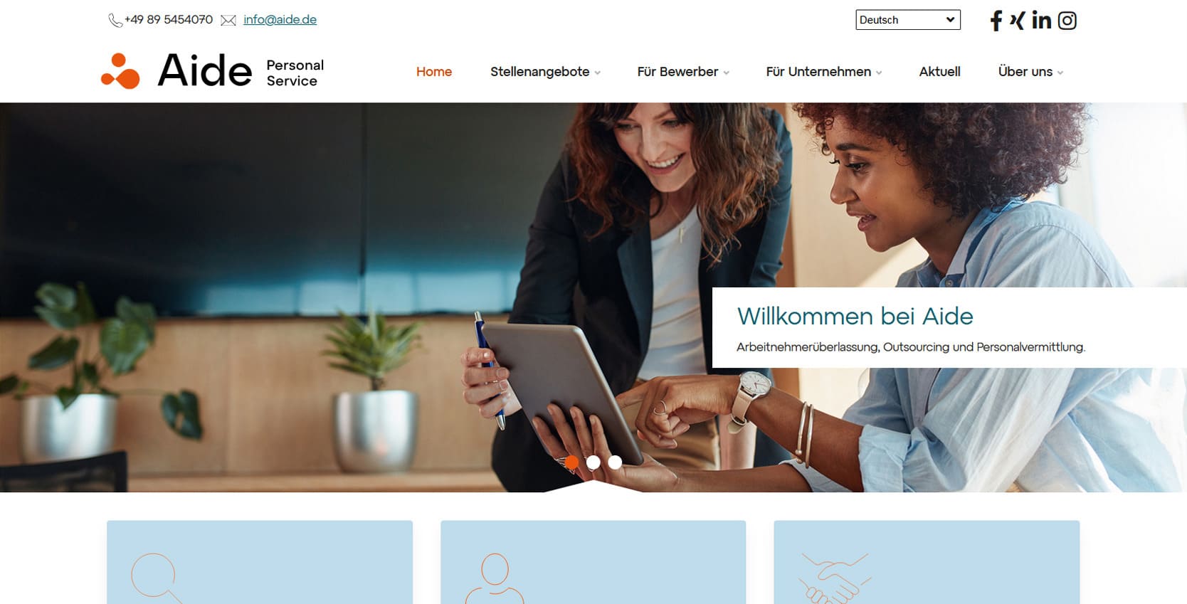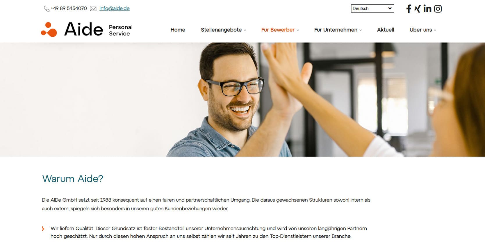 Seit 1988 ist Aide GmbH ein zuverlässiger Partner in den Bereichen Arbeitnehmerüberlassung, Outsourcing und Personalvermittlung. Mit über 25 Standorten deutschlandweit und einem starken Netzwerk zu führenden Unternehmen bietet Aide Bewerbern und Arbeitgebern gleichermaßen professionelle Lösungen.Die neue Website vereint ein modernes, klares Design mit einer strukturierten Navigation. Bewerber finden schnell passende Stellenangebote, können sich online bewerben und profitieren von der langjährigen Erfahrung des Unternehmens. Für Unternehmen werden Dienstleistungen und Vorteile übersichtlich dargestellt - von der Vermittlung qualifizierter Fachkräfte bis hin zu individuellen Outsourcing-Konzepten. Im Mittelpunkt steht die Benutzerfreundlichkeit: Klare Inhalte, einfache Bewerbungsprozesse und mobile Optimierung sorgen für ein positives Nutzererlebnis. Ergänzt wird die Seite durch aktuelle Unternehmensnews und Auszeichnungen, die die starke Marktposition von Aide unterstreichen.
