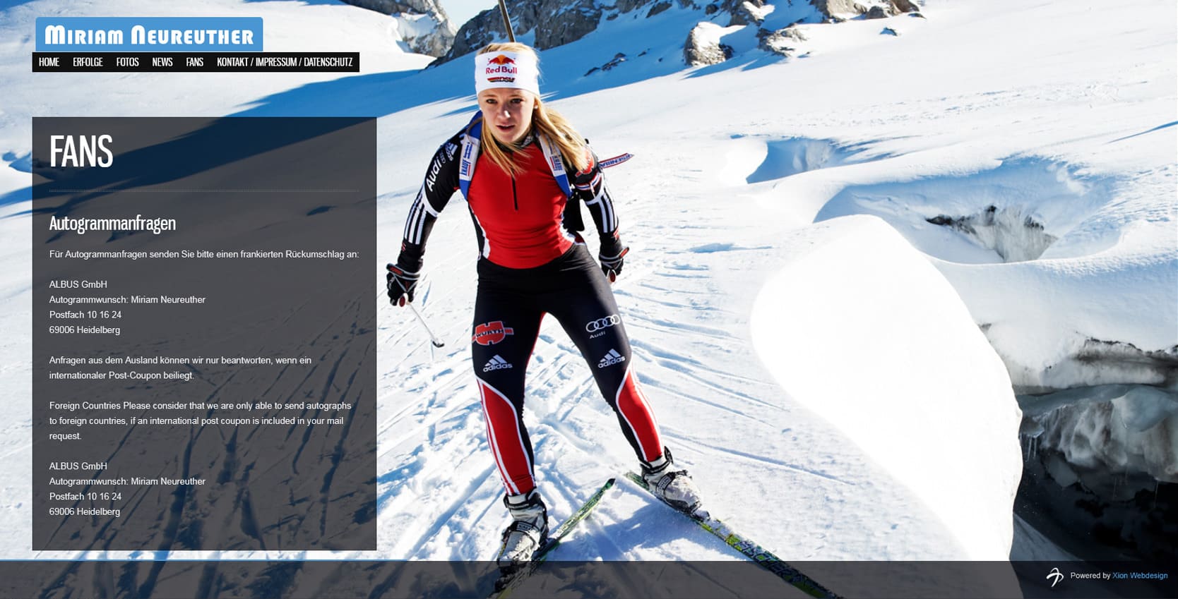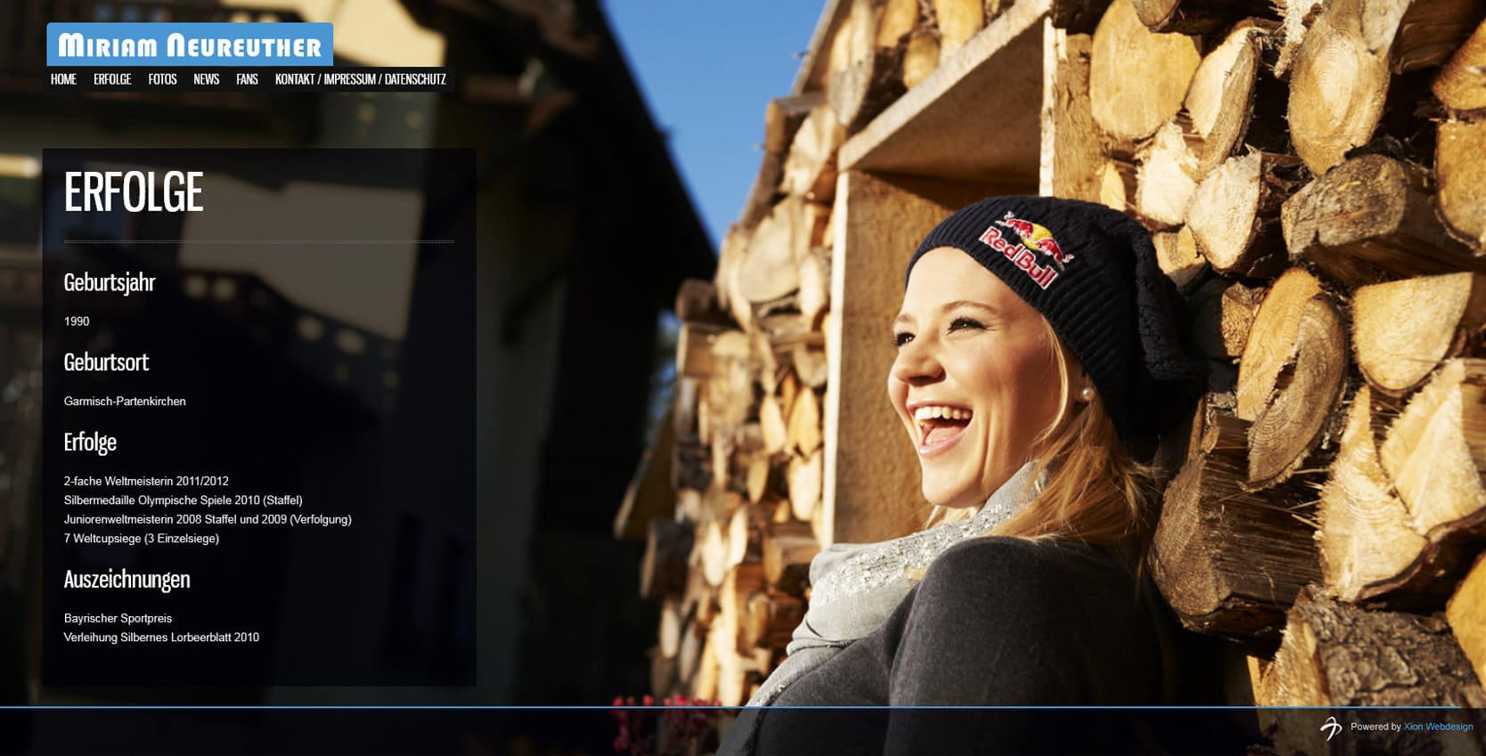Miriam Neureuther, ehemalige Biathletin und Skilangläuferin, ist eine der bekanntesten Sportlerinnen Deutschlands. Mit ihrer neuen Website präsentiert sie ihre sportlichen Erfolge, persönliche Einblicke sowie aktuelle Projekte in einem modernen und klaren Design. Ziel war es, einen authentischen Auftritt zu schaffen, der ihre Persönlichkeit, ihre Karriere und ihre Rolle als Mutter und öffentliche Figur verbindet.Die Website vereint sportliche Highlights mit einem emotionalen Einblick in das Leben von Miriam Neureuther. Besucher finden News, Fotos, Fan-Informationen und die wichtigsten Stationen ihrer sportlichen Laufbahn. Durch großformatige Bilder und eine übersichtliche Struktur entsteht ein Auftritt, der sowohl Fans als auch Partnern gerecht wird. Ein wichtiger Fokus lag auf Benutzerfreundlichkeit und mobiler Optimierung, damit die Inhalte auf allen Endgeräten schnell und ansprechend dargestellt werden. Gleichzeitig sorgt das CMS für eine einfache Pflege und schnelle Aktualisierung neuer Inhalte.