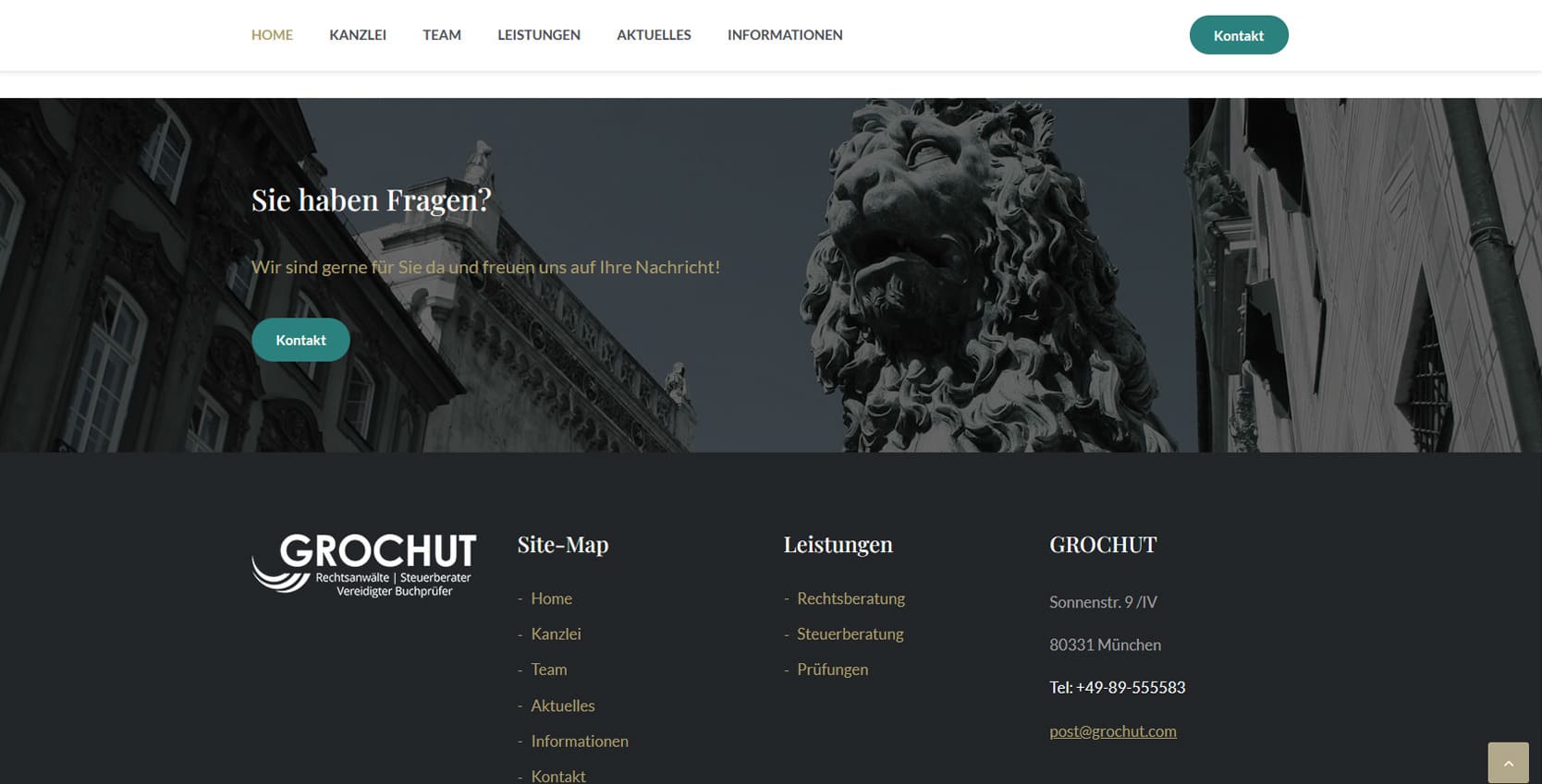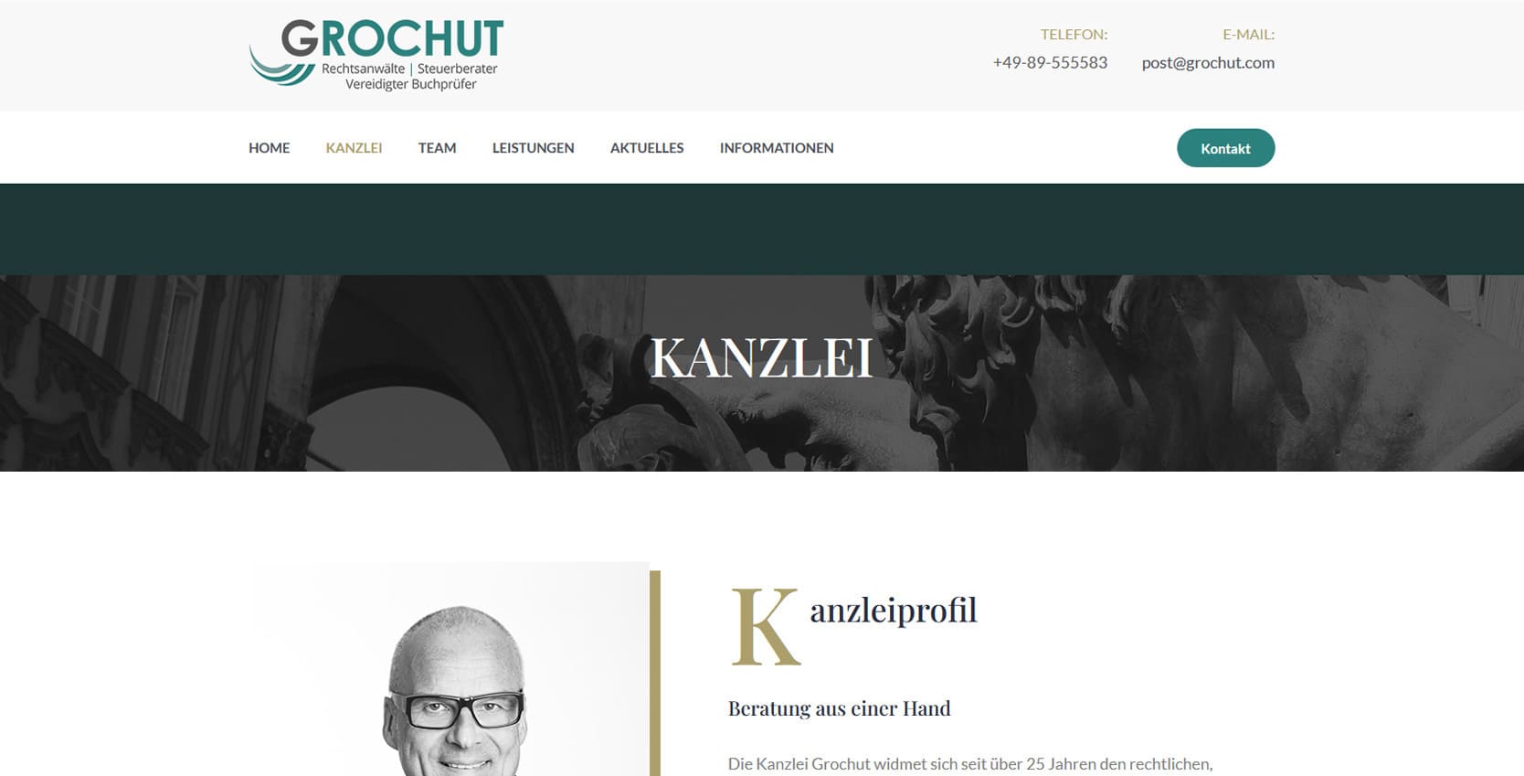 Die Kanzlei Grochut in München vereint unter einem Dach Rechtsberatung, Steuerberatung und Wirtschaftsprüfung. Mandanten profitieren von einer ganzheitlichen Betreuung, die juristische, steuerliche und betriebswirtschaftliche Aspekte miteinander verbindet - praxisnah, präzise und lösungsorientiert.Die neue Website präsentiert die Kanzlei in einem klaren, seriösen Design, das Professionalität und Vertrauen ausstrahlt. Besucher finden Informationen zu den drei Hauptbereichen - Rechtsberatung, Steuerberatung und Prüfungen - sowie zum Team und aktuellen Themen. Ziel war es, den umfassenden Beratungsansatz der Kanzlei digital sichtbar zu machen und Mandanten einen schnellen Zugang zum passenden Rechtsanwalt oder Berater zu bieten. Die Seite kombiniert eine strukturierte Navigation mit dezentem Corporate Design und ist vollständig mobil optimiert. Dadurch wird sie gleichermaßen für Unternehmen, Privatpersonen und Geschäftspartner nutzbar - klar, informativ und kompetent.