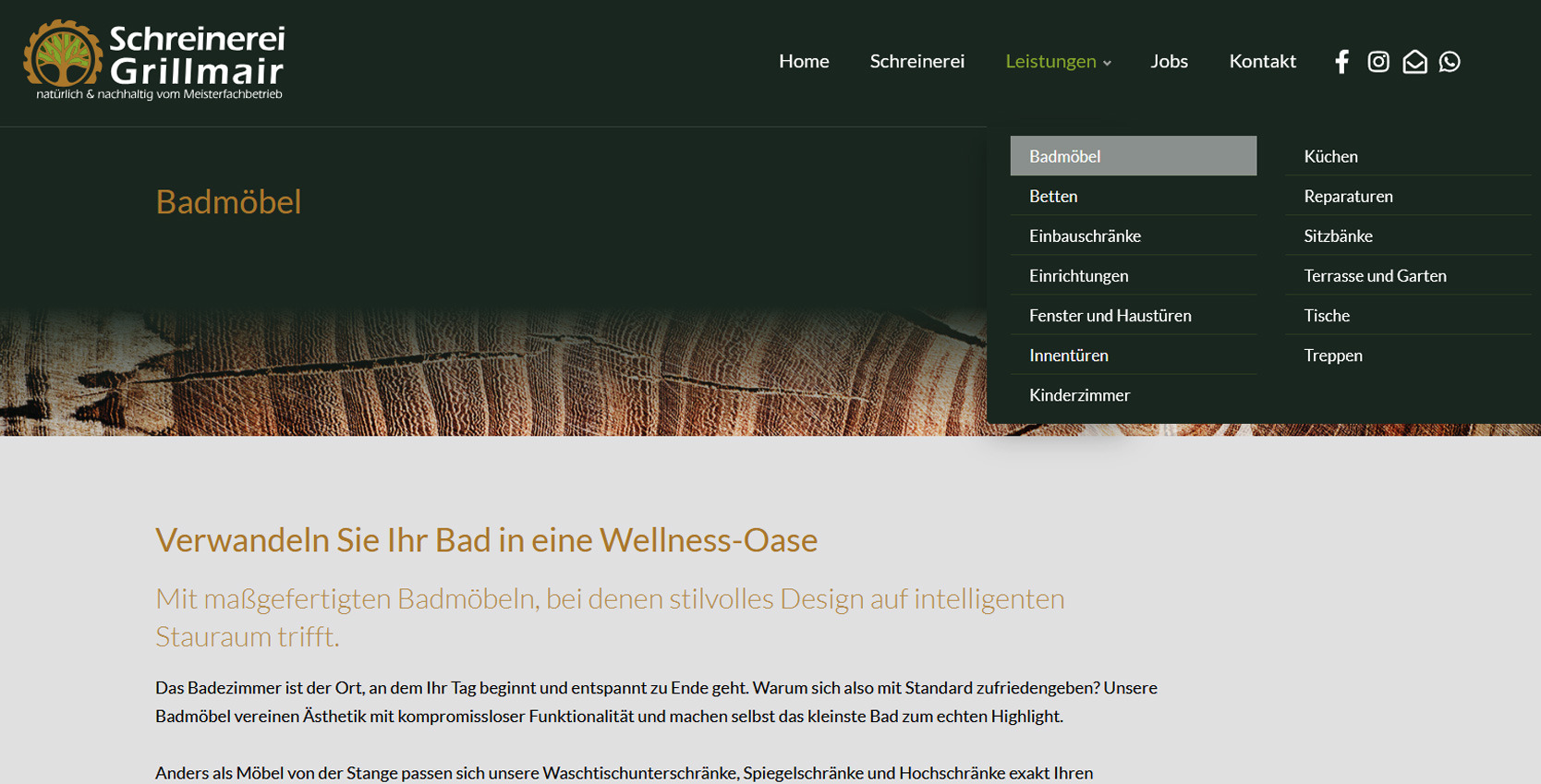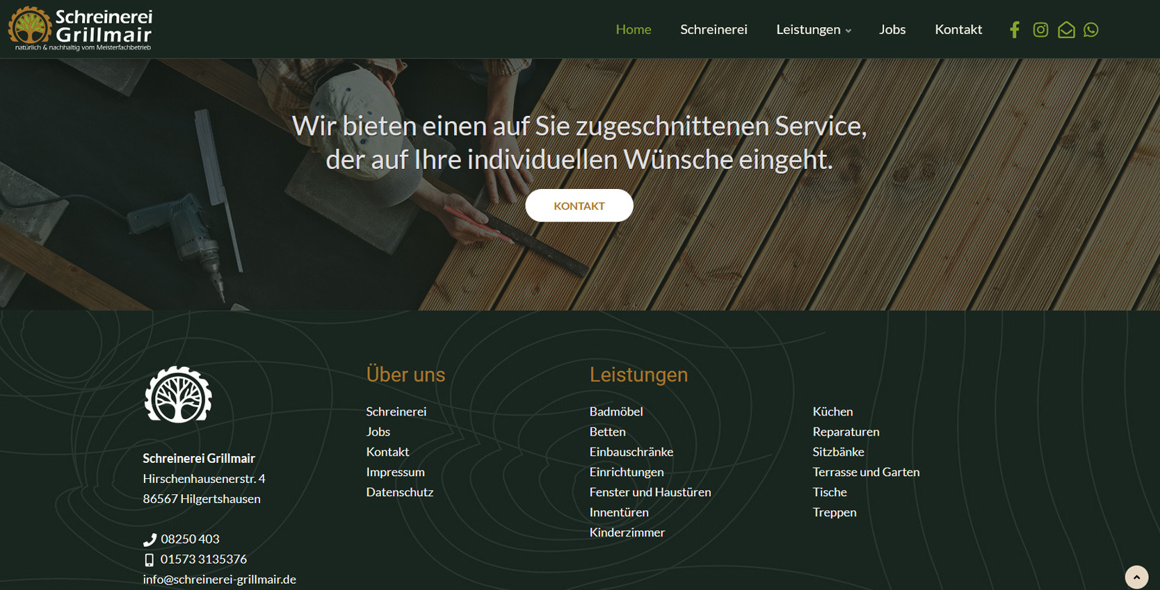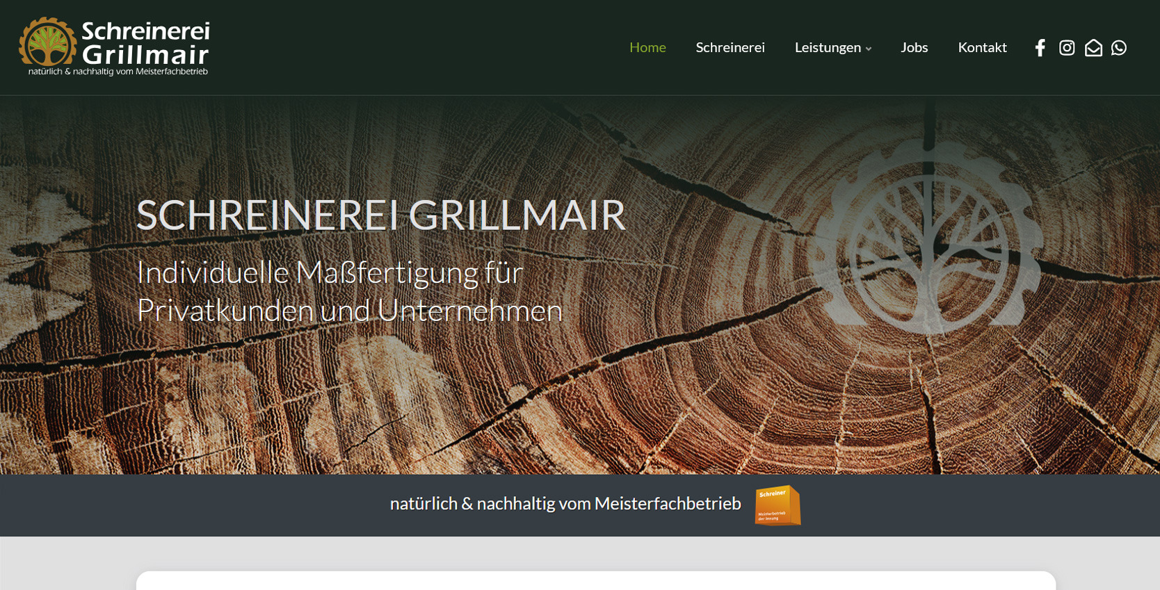 Schreinerei Grillmair ist ein traditionsreicher Meisterfachbetrieb aus Hilgertshausen, der seit 1949 für echte Handwerksqualität steht. Unter der Leitung von Schreinermeister Thomas Grillmair - bereits in dritter Generation - verbindet das Unternehmen traditionelles Handwerk mit moderner Technik. Das Leistungsspektrum reicht von maßgefertigten Küchen, Einbauschränken und Betten über Fenster, Haustüren und Innentüren bis hin zu Kinderzimmern, Treppen, Sitzbänken und Gartengestaltung - alles natürlich, nachhaltig und aus einer Hand.Die neue Website der Schreinerei Grillmair präsentiert den Betrieb klar, handwerklich und hochwertig. Besucher finden auf einen Blick alle Leistungsbereiche, Informationen zum Unternehmen sowie einfache Kontaktmöglichkeiten. Ziel war es, die Vielfalt des Angebots übersichtlich darzustellen und gleichzeitig die persönliche Handschrift des Familienbetriebs spürbar zu machen. Das Webdesign Schreinerei Hilgertshausen ist warm, strukturiert und modern gestaltet - mit mobiloptimierter Darstellung und regionaler Ausrichtung für Privat- und Gewerbekunden in der Region Dachau.
