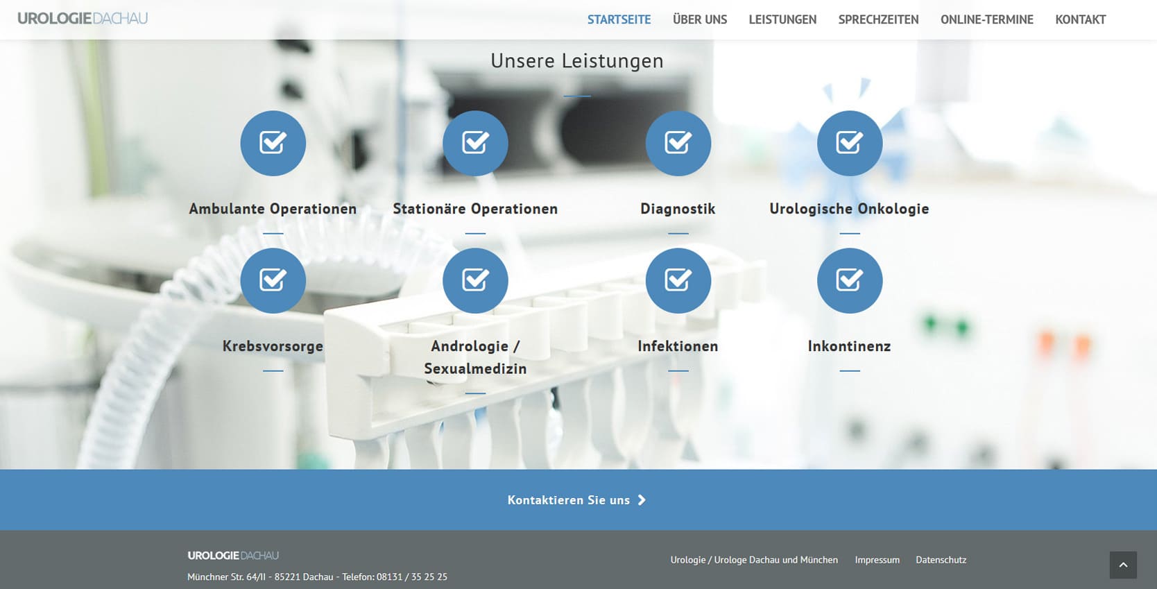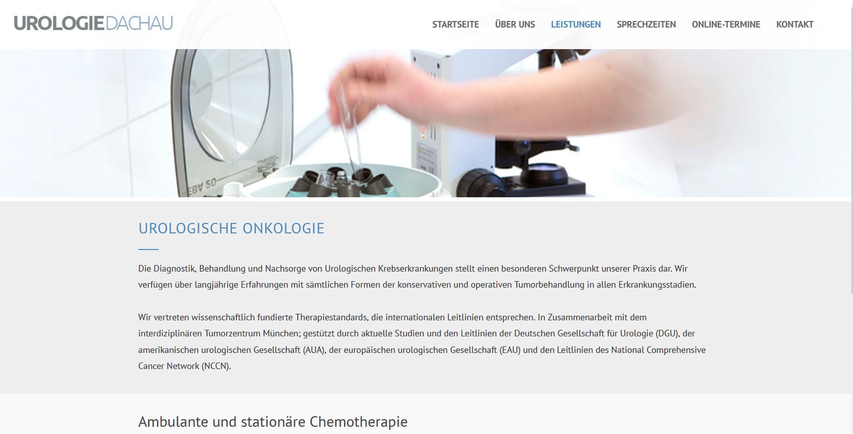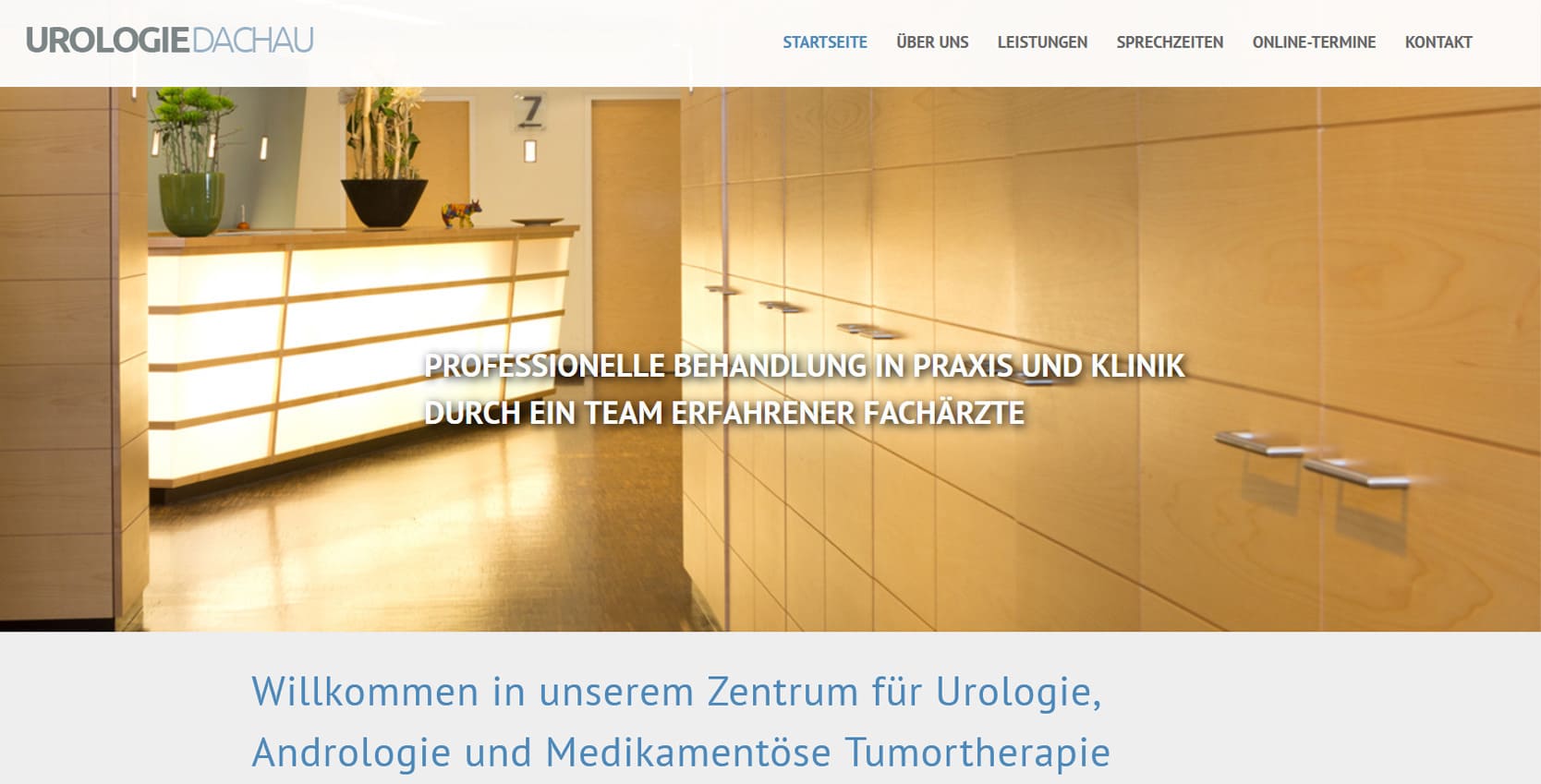 Die Gemeinschaftspraxis Urologie Dachau / München steht für moderne, patientenorientierte Medizin in den Bereichen Urologie, Andrologie und medikamentöse Tumortherapie. Das erfahrene Ärzteteam bietet ambulante und stationäre Behandlungen, Vorsorgeuntersuchungen sowie spezialisierte Diagnostik auf höchstem fachlichen Niveau.Mit der neuen Website wurde eine professionelle und vertrauensvolle Online-Präsenz geschaffen, die Patienten umfassend informiert und den Zugang zur Praxis erleichtert. Besucher finden detaillierte Informationen zu allen Leistungen - von der Krebsvorsorge über Andrologie bis hin zu operativen Eingriffen. Zudem sind Online-Termine, Sprechzeiten und aktuelle Hinweise (z. B. Praxiszeiten, Stellenausschreibungen) einfach abrufbar. Besonderer Wert lag auf einer klaren, medizinisch seriösen Gestaltung, die Vertrauen schafft. Die Website ist vollständig mobil optimiert, bietet strukturierte Navigation und kurze Ladezeiten - ideal für Patienten, die unterwegs Termine oder Informationen suchen.